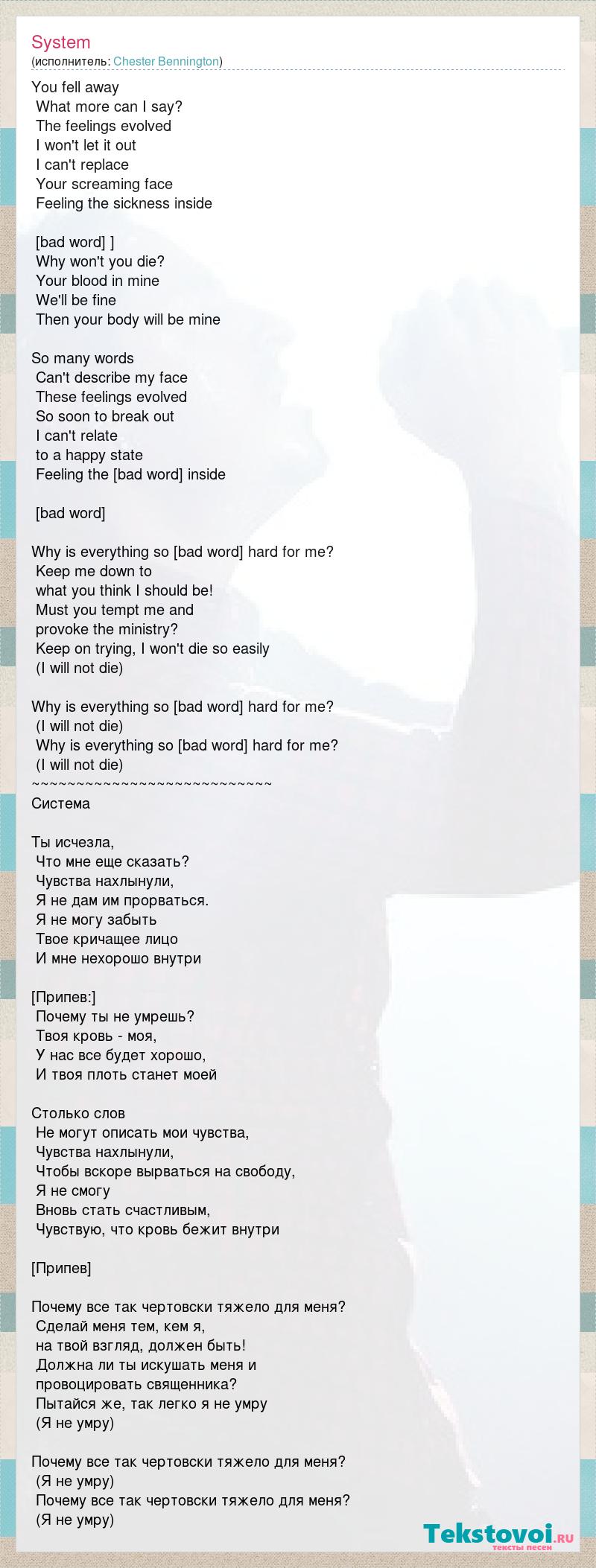 You fell away What more can I say? The feelings evolved I won't let it out I can't replace Your screaming face Feeling the sickness inside [bad word] ] Why won't you die? Your blood in mine We'll be fine Then your body will be mine So many words Can't describe my face These feelings evolved So soon to break out I can't relate to a happy state Feeling the [bad word] inside [bad word] Why is everything so [bad word] hard for me? Keep me down to what you think I should be! Must you tempt me and provoke the ministry? Keep on trying, I won't die so easily (I will not die) Why is everything so [bad word] hard for me? (I will not die) Why is everything so [bad word] hard for me? (I will not die) ~~~~~~~~~~~~~~~~~~~~~~~~~~~ Система Ты исчезла, Что мне еще сказать? Чувства нахлынули, Я не дам им прорваться. Я не могу забыть Твое кричащее лицо И мне нехорошо внутри [Припев:] Почему ты не умрешь? Твоя кровь - моя, У нас все будет хорошо, И твоя плоть станет моей Столько слов Не могут описать мои чувства, Чувства нахлынули, Чтобы вскоре вырваться на свободу, Я не смогу Вновь стать счастливым, Чувствую, что кровь бежит внутри [Припев] Почему все так чертовски тяжело для меня? Сделай меня тем, кем я, на твой взгляд, должен быть! Должна ли ты искушать меня и провоцировать священника? Пытайся же, так легко я не умру (Я не умру) Почему все так чертовски тяжело для меня? (Я не умру) Почему все так чертовски тяжело для меня? (Я не умру)