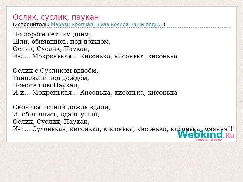 По дороге летним днём, Шли, обнявшись, под дождём, Ослик, Суслик, Паукан, И-и… Мокренькая… Кисонька, кисонька, кисонька Ослик с Сусликом вдвоём, Танцевали под дождём, Помогал им Паукан, И-и… Мокренькая… Кисонька, кисонька, кисонька Скрылся летний дождь вдали, И, обнявшись, вдаль ушли, Ослик, Суслик, Паукан, И-и… Сухонькая, кисонька, кисонька, кисонька, кисонька, мяяяяя!!!