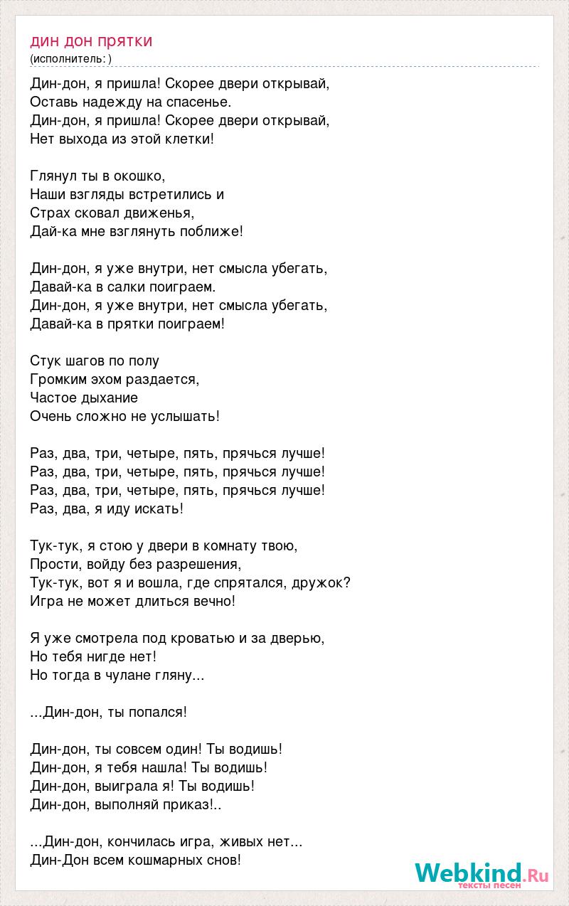 Дин-дон, я пришла! Скорее двери открывай, Оставь надежду на спасенье. Дин-дон, я пришла! Скорее двери открывай, Нет выхода из этой клетки! Глянул ты в окошко, Наши взгляды встретились и Страх сковал движенья, Дай-ка мне взглянуть поближе! Дин-дон, я уже внутри, нет смысла убегать, Давай-ка в салки поиграем. Дин-дон, я уже внутри, нет смысла убегать, Давай-ка в прятки поиграем! Стук шагов по полу Громким эхом раздается, Частое дыхание Очень сложно не услышать! Раз, два, три, четыре, пять, прячься лучше! Раз, два, три, четыре, пять, прячься лучше! Раз, два, три, четыре, пять, прячься лучше! Раз, два, я иду искать! Тук-тук, я стою у двери в комнату твою, Прости, войду без разрешения, Тук-тук, вот я и вошла, где спрятался, дружок? Игра не может длиться вечно! Я уже смотрела под кроватью и за дверью, Но тебя нигде нет! Но тогда в чулане гляну... ...Дин-дон, ты попался! Дин-дон, ты совсем один! Ты водишь! Дин-дон, я тебя нашла! Ты водишь! Дин-дон, выиграла я! Ты водишь! Дин-дон, выполняй приказ!.. ...Дин-дон, кончилась игра, живых нет... Дин-Дон всем кошмарных снов!