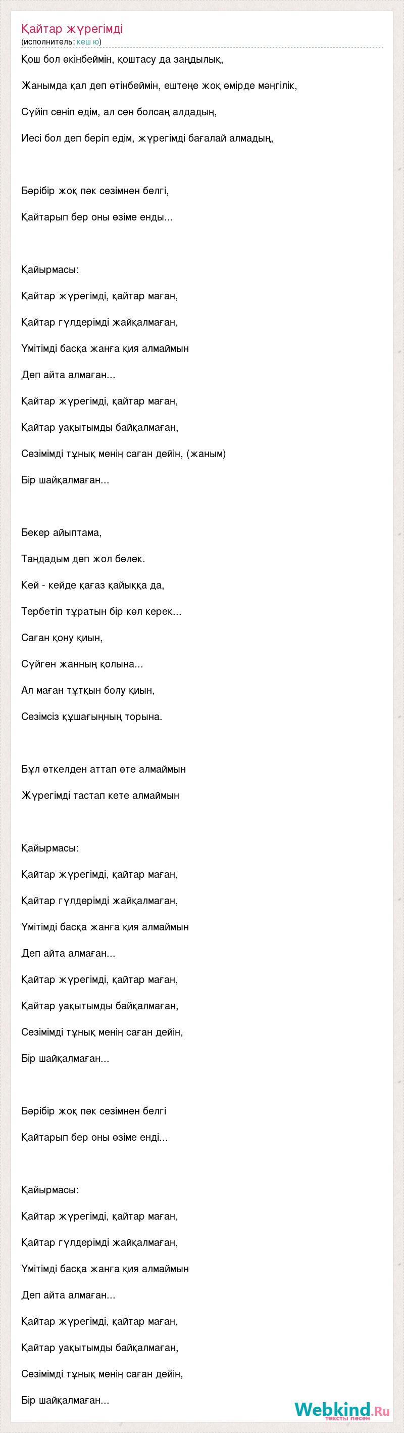 Қош бол өкінбеймін, қоштасу да заңдылық, Жанымда қал деп өтінбеймін, ештеңе жоқ өмірде мәңгілік, Сүйіп сеніп едім, ал сен болсаң алдадың, Иесі бол деп беріп едім, жүрегімді бағалай алмадың, Бәрібір жоқ пәк сезімнен белгі, Қайтарып бер оны өзіме енды... Қайырмасы: Қайтар жүрегімді, қайтар маған, Қайтар гүлдерімді жайқалмаған, Үмітімді басқа жанға қия алмаймын Деп айта алмаған... Қайтар жүрегімді, қайтар маған, Қайтар уақытымды байқалмаған, Сезімімді тұнық менің саған дейін, (жаным) Бір шайқалмаған... Бекер айыптама, Таңдадым деп жол бөлек. Кей - кейде қағаз қайыққа да, Тербетіп тұратын бір көл керек... Саған қону қиын, Сүйген жанның қолына... Ал маған тұтқын болу қиын, Сезімсіз құшағыңның торына. Бұл өткелден аттап өте алмаймын Жүрегімді тастап кете алмаймын Қайырмасы: Қайтар жүрегімді, қайтар маған, Қайтар гүлдерімді жайқалмаған, Үмітімді басқа жанға қия алмаймын Деп айта алмаған... Қайтар жүрегімді, қайтар маған, Қайтар уақытымды байқалмаған, Сезімімді тұнық менің саған дейін, Бір шайқалмаған... Бәрібір жоқ пәк сезімнен белгі Қайтарып бер оны өзіме енді... Қайырмасы: Қайтар жүрегімді, қайтар маған, Қайтар гүлдерімді жайқалмаған, Үмітімді басқа жанға қия алмаймын Деп айта алмаған... Қайтар жүрегімді, қайтар маған, Қайтар уақытымды байқалмаған, Сезімімді тұнық менің саған дейін, Бір шайқалмаған...