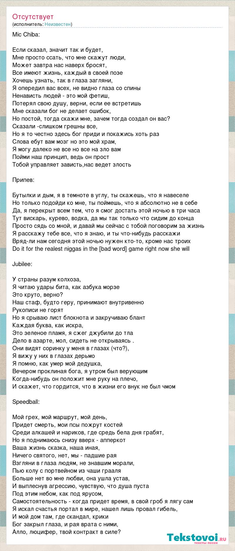 Mic Chiba: Если сказал, значит так и будет, Мне просто ссать, что мне скажут люди, Может завтра нас наверх бросят, Все имеют жизнь, каждый в своей позе Хочешь узнать, так в глаза загляни, Я опередил вас всех, не видно глаза со спины Ненависть людей - это мой фетиш, Потерял свою душу, верни, если ее встретишь Мне сказали бог не делает ошибок, Но постой, тогда скажи мне, зачем тогда создал он вас? Сказали -слишком грешны все, Но я то честно здесь бог приди и покажись хоть раз Слова ебут вам мозг но это мой храм, Я могу далеко не все но все на зло вам Пойми наш принцип, ведь он прост Тобой управляет зависть,нас ведет злость Припев: Бутылки и дым, я в темноте в углу, ты скажешь, что я навеселе Но только подойди ко мне, ты поймешь, что я абсолютно не в себе Да, я перекрыт всем тем, что я смог достать этой ночью в три часа Тут вискарь, курево, водка, да мы так только что сидим до конца Просто сядь со мной, и давай мы сейчас с тобой поговорим за жизнь Я расскажу тебе все, что я знаю, и ты что-нибудь расскажи Вряд-ли нам сегодня этой ночью нужен кто-то, кроме нас троих Do it for the realest niggas in the [bad word] game right now she will Jubilee: У страны разум колхоза, Я читаю удары бита, как азбука морзе Это круто, верно? Наш стаф, будто геру, принимают внутривенно Рукописи не горят Но я срываю лист блокнота и закручиваю блант Каждая буква, как искра, Это зеленое пламя, я сжег джубили до тла Дело в азарте, мол, сидеть не открываясь . Они видят соринку у меня в глазах (что?), Я вижу у них в глазах дерьмо Я помню, как умер мой дедушка, Вечером проклиная бога, я утром был верующим Когда-нибудь он положит мне руку на плечо, И скажет, что гордится, что в жизни его внук не был чмом Speedball: Мой грех, мой маршрут, мой день, Придет смерть, мои псы пожрут костей Среди алкашей и нариков, где средь бела дня грабят, Но я поднимаюсь снизу вверх - апперкот Ваша жизнь сказка, наша иная, Ничего святого, нет, мы - падшие рая Взгляни в глаза людям, не знавшим морали, Пью колу с портвейном из чаши грааля Больше нет во мне любви, она ушла устав, И выплеснув агрессию, чувствую, что душа пуста Под этим небом, как под ярусом, Самостоятельность - когда придет время, в свой гроб я лягу сам Я искал счастья портал в мире, нашел лишь провал гибель, И мой дом там, где скандал, крики Бог закрыл глаза, и рая врата с ними, Алло, люцифер, твой контракт в силе?