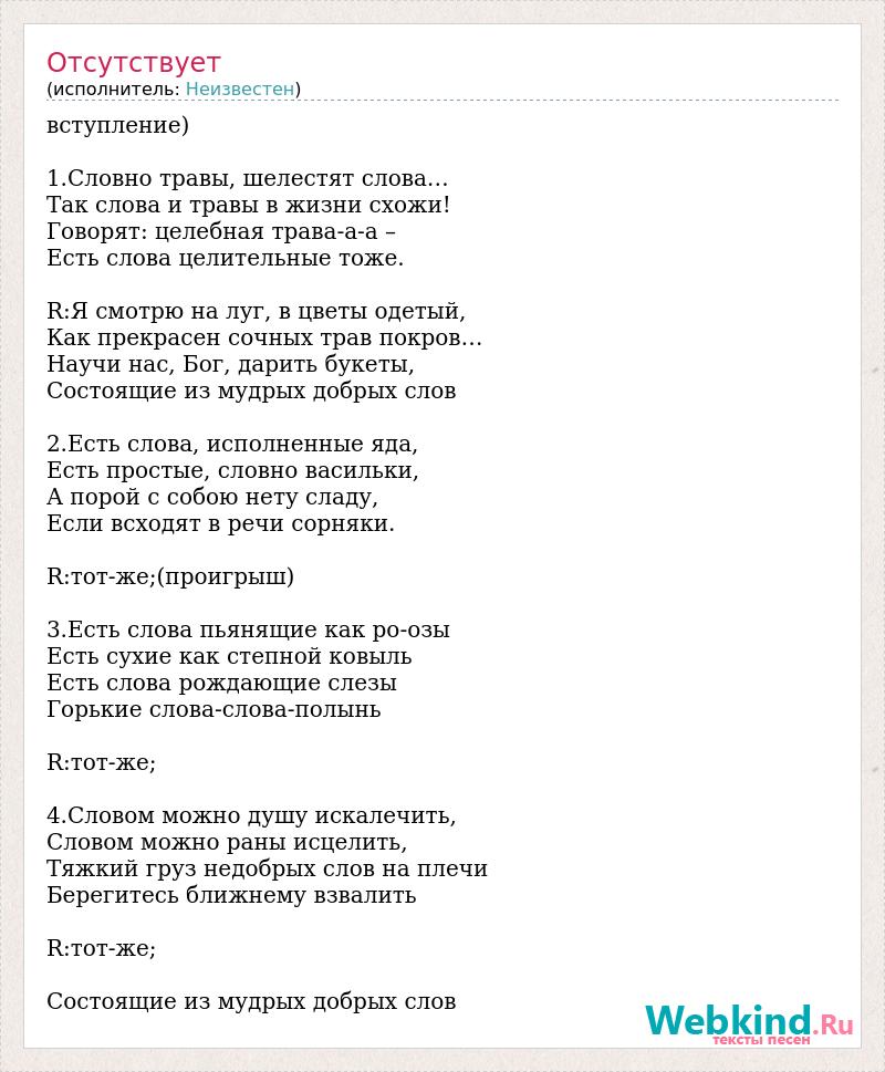 вступление) 1.Словно травы, шелестят слова… Так слова и травы в жизни схожи! Говорят: целебная трава-а-а – Есть слова целительные тоже. R:Я смотрю на луг, в цветы одетый, Как прекрасен сочных трав покров… Научи нас, Бог, дарить букеты, Состоящие из мудрых добрых слов 2.Есть слова, исполненные яда, Есть простые, словно васильки, А порой с собою нету сладу, Если всходят в речи сорняки. R:тот-же;(проигрыш) 3.Есть слова пьянящие как ро-озы Есть сухие как степной ковыль Есть слова рождающие слезы Горькие слова-слова-полынь R:тот-же; 4.Словом можно душу искалечить, Словом можно раны исцелить, Тяжкий груз недобрых слов на плечи Берегитесь ближнему взвалить R:тот-же; Состоящие из мудрых добрых слов