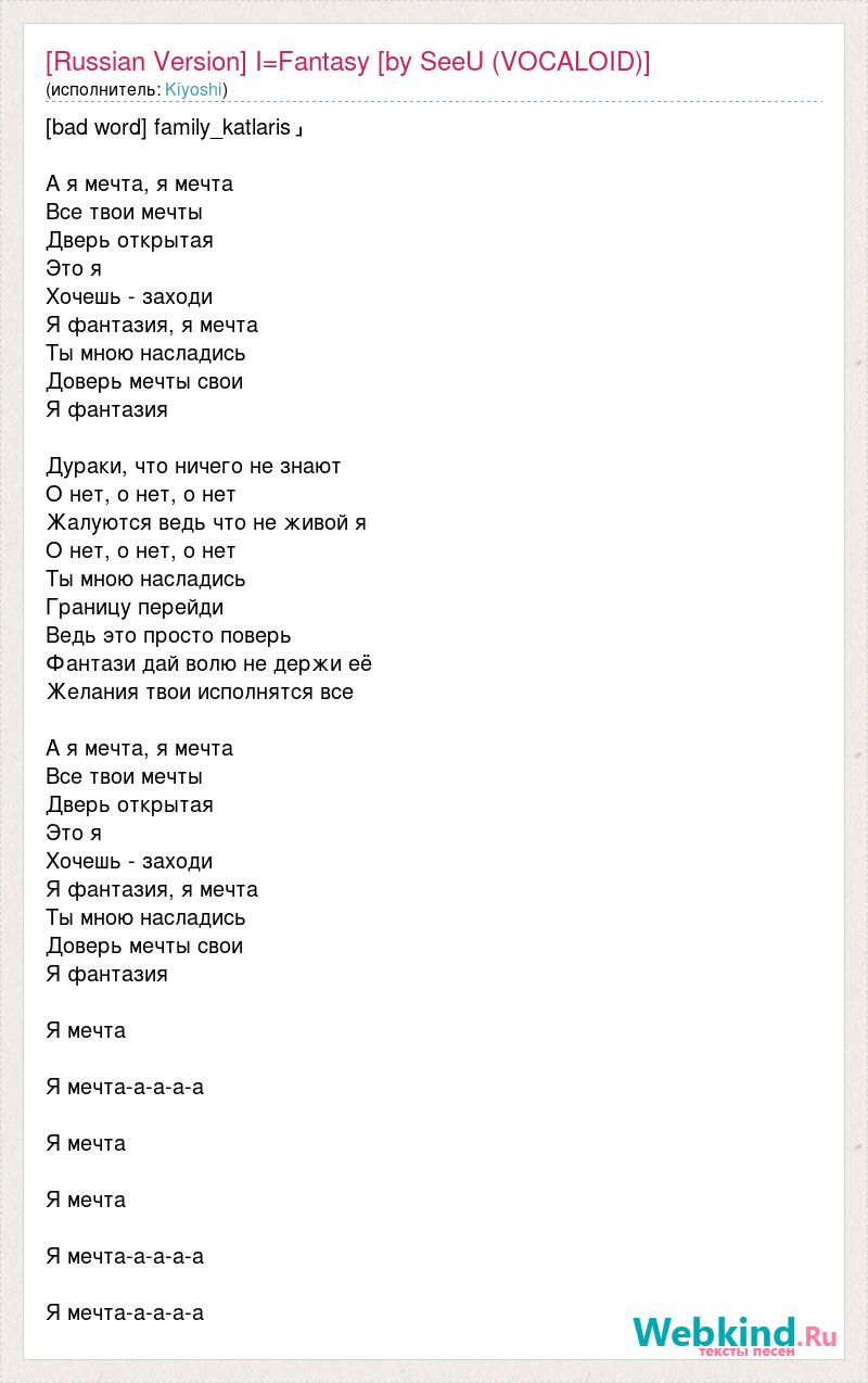 [bad word] family_katlaris」 А я мечта, я мечта Все твои мечты Дверь открытая Это я Хочешь - заходи Я фантазия, я мечта Ты мною насладись Доверь мечты свои Я фантазия Дураки, что ничего не знают О нет, о нет, о нет Жалуются ведь что не живой я О нет, о нет, о нет Ты мною насладись Границу перейди Ведь это просто поверь Фантази дай волю не держи её Желания твои исполнятся все А я мечта, я мечта Все твои мечты Дверь открытая Это я Хочешь - заходи Я фантазия, я мечта Ты мною насладись Доверь мечты свои Я фантазия Я мечта Я мечта-а-а-а-а Я мечта Я мечта Я мечта-а-а-а-а Я мечта-а-а-а-а