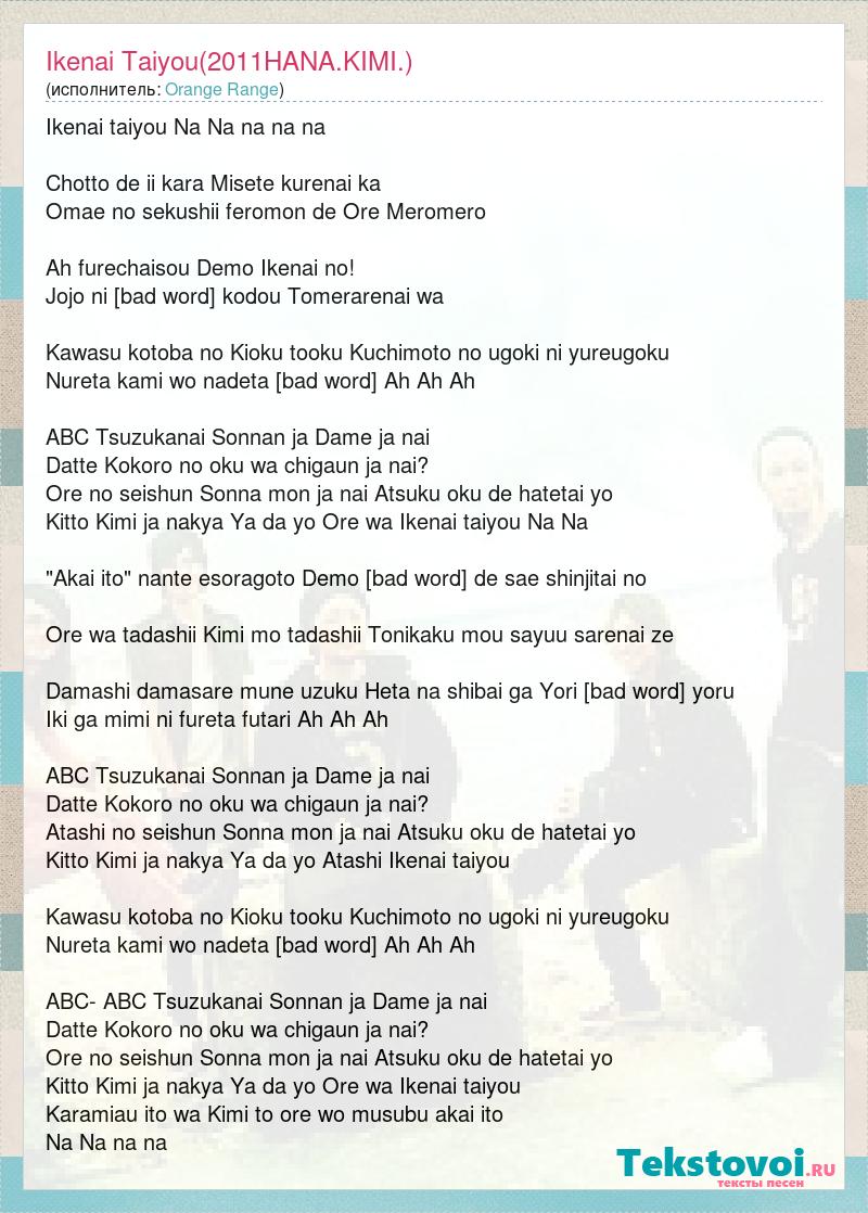 Ikenai taiyou Na Na na na na Chotto de ii kara Misete kurenai ka Omae no sekushii feromon de Ore Meromero Ah furechaisou Demo Ikenai no! Jojo ni takanaru kodou Tomerarenai wa Kawasu kotoba no Kioku tooku Kuchimoto no ugoki ni yureugoku Nureta kami wo nadeta [bad word] Ah Ah Ah ABC Tsuzukanai Sonnan ja Dame ja nai Datte Kokoro no oku wa chigaun ja nai? Ore no seishun Sonna mon ja nai Atsuku oku de hatetai yo Kitto Kimi ja nakya Ya da yo Ore wa Ikenai taiyou Na Na "Akai ito" nante esoragoto Demo [bad word] de sae shinjitai no Ore wa tadashii Kimi mo tadashii Tonikaku mou sayuu sarenai ze Damashi damasare mune uzuku Heta na shibai ga Yori moriageru yoru Iki ga mimi ni fureta futari Ah Ah Ah ABC Tsuzukanai Sonnan ja Dame ja nai Datte Kokoro no oku wa chigaun ja nai? Atashi no seishun Sonna mon ja nai Atsuku oku de hatetai yo Kitto Kimi ja nakya Ya da yo Atashi Ikenai taiyou Kawasu kotoba no Kioku tooku Kuchimoto no ugoki ni yureugoku Nureta kami wo nadeta [bad word] Ah Ah Ah ABC- ABC Tsuzukanai Sonnan ja Dame ja nai Datte Kokoro no oku wa chigaun ja nai? Ore no seishun Sonna mon ja nai Atsuku oku de hatetai yo Kitto Kimi ja nakya Ya da yo Ore wa Ikenai taiyou Karamiau ito wa Kimi to ore wo musubu akai ito Na Na na na