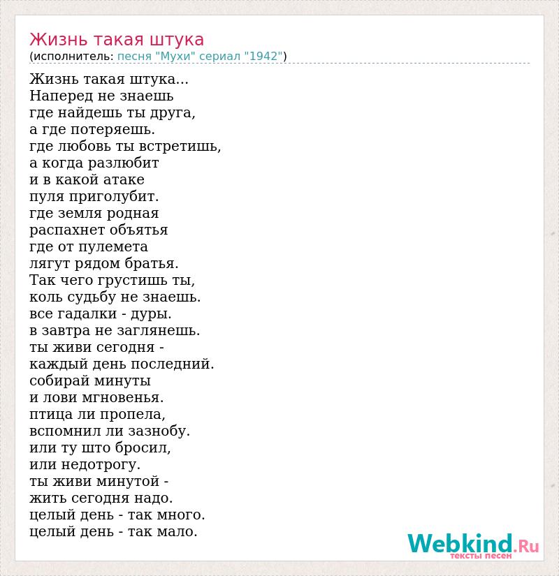 Жизнь такая штука... Наперед не знаешь где найдешь ты друга, а где потеряешь. где любовь ты встретишь, а когда разлюбит и в какой атаке пуля приголубит. где земля родная распахнет объятья где от пулемета лягут рядом братья. Так чего грустишь ты, коль судьбу не знаешь. все гадалки - дуры. в завтра не заглянешь. ты живи сегодня - каждый день последний. собирай минуты и лови мгновенья. птица ли пропела, вспомнил ли зазнобу. или ту што бросил, или недотрогу. ты живи минутой - жить сегодня надо. целый день - так много. целый день - так мало.