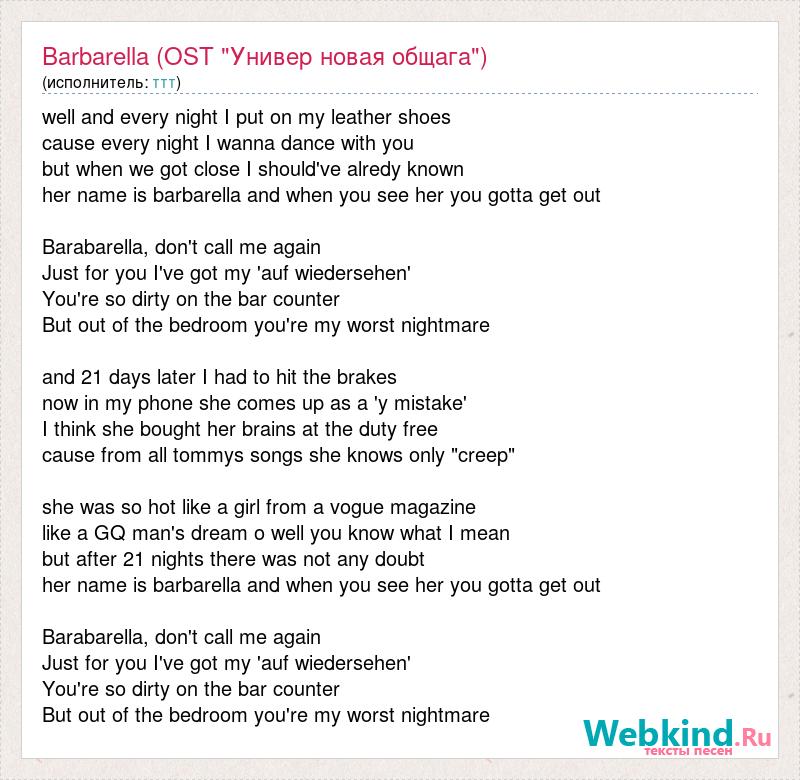 well and every night I put on my leather shoes cause every night I wanna dance with you but when we got close I should've alredy known her name is barbarella and when you see her you gotta get out Barabarella, don't call me again Just for you I've got my 'auf wiedersehen' You're so dirty on the bar counter But out of the bedroom you're my worst nightmare and 21 days later I had to hit the brakes now in my phone she comes up as a 'y mistake' I think she bought her brains at the duty free cause from all tommys songs she knows only "creep" she was so hot like a girl from a vogue magazine like a GQ man's dream o well you know what I mean but after 21 nights there was not any doubt her name is barbarella and when you see her you gotta get out Barabarella, don't call me again Just for you I've got my 'auf wiedersehen' You're so dirty on the bar counter But out of the bedroom you're my worst nightmare