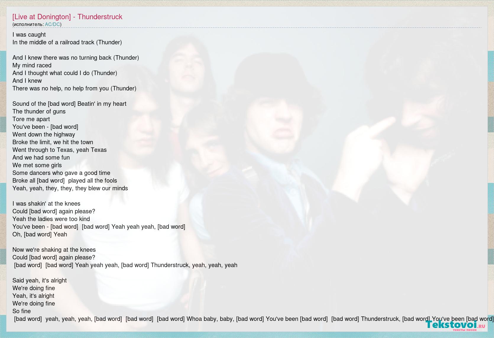 I was caught In the middle of a railroad track (Thunder) And I knew there was no turning back (Thunder) My mind raced And I thought what could I do (Thunder) And I knew There was no help, no help from you (Thunder) Sound of the drums Beatin' in my heart The thunder of guns Tore me apart You've been - thunderstruck Went down the highway Broke the limit, we hit the town Went through to Texas, yeah Texas And we had some fun We met some girls Some dancers who gave a good time Broke all the rules, played all the fools Yeah, yeah, they, they, they blew our minds I was shakin' at the knees Could I come again please? Yeah the ladies were too kind You've been - thunderstruck, thunderstruck Yeah yeah yeah, thunderstruck Oh, thunderstruck Yeah Now we're shaking at the knees Could I come again please? Thunderstruck, thunderstruck Yeah yeah yeah, thunderstruck Thunderstruck, yeah, yeah, yeah Said yeah, it's alright We're doing fine Yeah, it's alright We're doing fine So fine Thunderstruck, yeah, yeah, yeah, Tunderstruck, thunderstruck, thunderstruck Whoa baby, baby, thunderstruck You've been thunderstruck, thunderstruck Thunderstruck, thunderstruck You've been thunderstruck