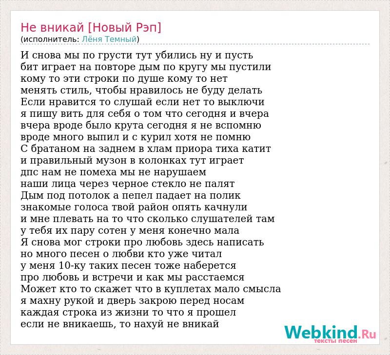 И снова мы по грусти тут убились ну и пусть бит играет на повторе дым по кругу мы пустили кому то эти строки по душе кому то нет менять стиль, чтобы нравилось не буду делать Если нравится то слушай если нет то выключи я пишу вить для себя о том что сегодня и вчера вчера вроде было крута сегодня я не вспомню вроде много выпил и с курил хотя не помню С братаном на заднем в хлам приора тиха катит и правильный музон в колонках тут играет дпс нам не помеха мы не нарушаем наши лица через черное стекло не палят Дым под потолок а пепел падает на полик знакомые голоса твой район опять качнули и мне плевать на то что сколько слушателей там у тебя их пару сотен у меня конечно мала Я снова мог строки про любовь здесь написать но много песен о любви кто уже читал у меня 10-ку таких песен тоже наберется про любовь и встречи и как мы расстаемся Может кто то скажет что в куплетах мало смысла я махну рукой и дверь закрою перед носам каждая строка из жизни то что я прошел если не вникаешь, то нахуй не вникай