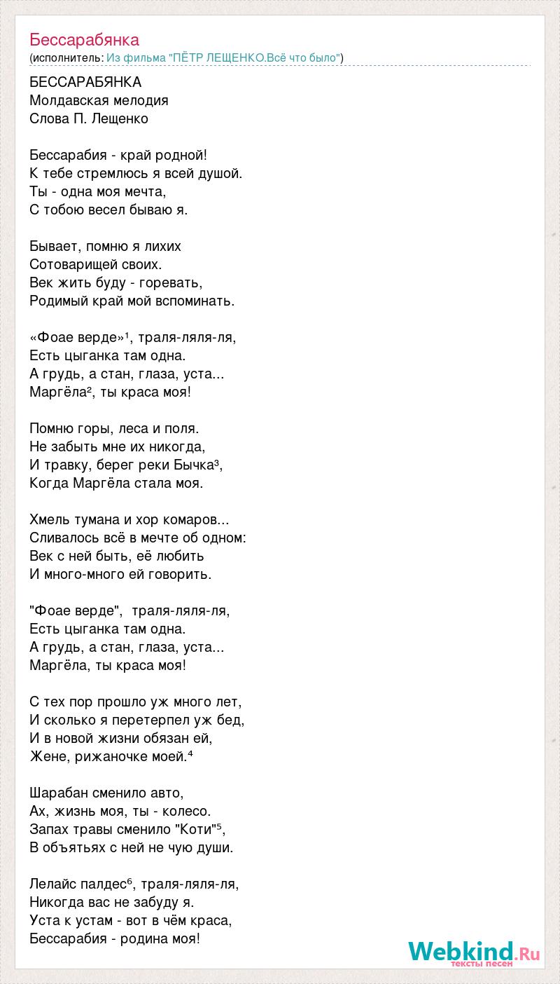 БЕССАРАБЯНКА Молдавская мелодия Слова П. Лещенко Бессарабия - край родной! К тебе стремлюсь я всей душой. Ты - одна моя мечта, С тобою весел бываю я. Бывает, помню я лихих Сотоварищей своих. Век жить буду - горевать, Родимый край мой вспоминать. «Фоае верде»¹, траля-ляля-ля, Есть цыганка там одна. А грудь, а стан, глаза, уста... Маргёла², ты краса моя! Помню горы, леса и поля. Не забыть мне их никогда, И травку, берег реки Бычка³, Когда Маргёла стала моя. Хмель тумана и хор комаров... Сливалось всё в мечте об одном: Век с ней быть, её любить И много-много ей говорить. "Фоае верде", траля-ляля-ля, Есть цыганка там одна. А грудь, а стан, глаза, уста... Маргёла, ты краса моя! С тех пор прошло уж много лет, И сколько я перетерпел уж бед, И в новой жизни обязан ей, Жене, рижаночке моей.⁴ Шарабан сменило авто, Ах, жизнь моя, ты - колесо. Запах травы сменило "Коти"⁵, В объятьях с ней не чую души. Лелайс палдес⁶, траля-ляля-ля, Никогда вас не забуду я. Уста к устам - вот в чём краса, Бессарабия - родина моя!