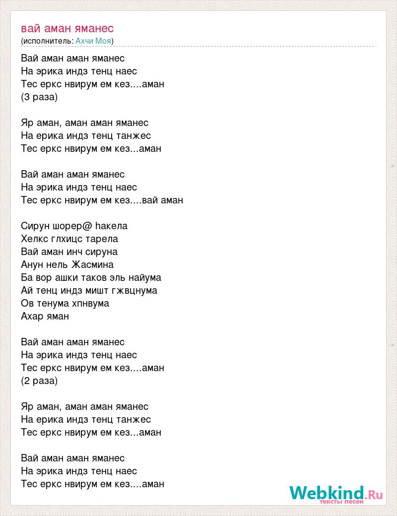 Вай аман аман яманес Hа эрика индз тенц наес Тес еркс нвирум ем кез....аман (3 раза) Яр аман, аман аман яманес Hа ерика индз тенц танжес Тес еркс нвирум ем кез...аман Вай аман аман яманес Hа эрика индз тенц наес Тес еркс нвирум ем кез....вай аман Сирун шорер@ hакела Хелкс глхицс тарела Вай аман инч сируна Анун нель Жасмина Ба вор ашки таков эль найума Ай тенц индз мишт гжвцнума Ов тенума хпнвума Ахар яман Вай аман аман яманес Hа эрика индз тенц наес Тес еркс нвирум ем кез....аман (2 раза) Яр аман, аман аман яманес Hа ерика индз тенц танжес Тес еркс нвирум ем кез...аман Вай аман аман яманес Hа эрика индз тенц наес Тес еркс нвирум ем кез....аман