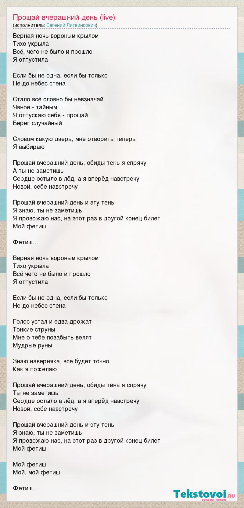 Верная ночь вороным крылом Тихо укрыла Всё, чего не было и прошло Я отпустила Если бы не одна, если бы только Не до небес стена Стало всё словно бы невзначай Явное - тайным Я отпускаю себя - прощай Берег случайный Словом какую дверь, мне отворить теперь Я выбираю Прощай вчерашний день, обиды тень я спрячу А ты не заметишь Сердце остыло в лёд, а я вперёд навстречу Новой, себе навстречу Прощай вчерашний день и эту тень Я знаю, ты не заметишь Я провожаю нас, на этот раз в другой конец билет Мой фетиш Фетиш... Верная ночь вороным крылом Тихо укрыла Всё чего не было и прошло Я отпустила Если бы не одна, если бы только Не до небес стена Голос устал и едва дрожат Тонкие струны Мне о тебе позабыть велят Мудрые руны Знаю наверняка, всё будет точно Как я пожелаю Прощай вчерашний день, обиды тень я спрячу Ты не заметишь Сердце остыло в лёд, а я вперёд навстречу Новой, себе навстречу Прощай вчерашний день и эту тень Я знаю, ты не заметишь Я провожаю нас, на этот раз в другой конец билет Мой фетиш Мой фетиш Мой, мой фетиш Фетиш...