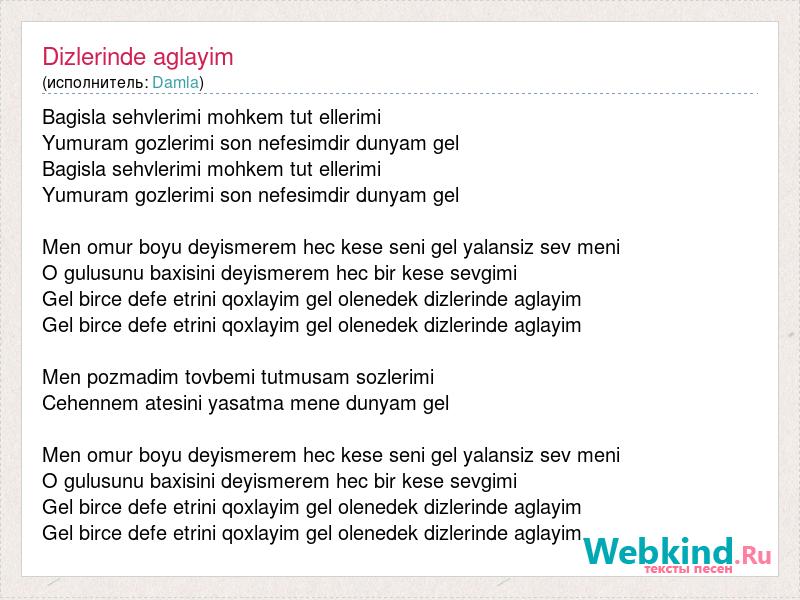 Bagisla sehvlerimi mohkem tut ellerimi Yumuram gozlerimi son nefesimdir dunyam gel Bagisla sehvlerimi mohkem tut ellerimi Yumuram gozlerimi son nefesimdir dunyam gel Men omur boyu deyismerem hec kese seni gel yalansiz sev meni O gulusunu baxisini deyismerem hec bir kese sevgimi Gel birce defe etrini qoxlayim gel olenedek dizlerinde aglayim Gel birce defe etrini qoxlayim gel olenedek dizlerinde aglayim Men pozmadim tovbemi tutmusam sozlerimi Cehennem atesini yasatma mene dunyam gel Men omur boyu deyismerem hec kese seni gel yalansiz sev meni O gulusunu baxisini deyismerem hec bir kese sevgimi Gel birce defe etrini qoxlayim gel olenedek dizlerinde aglayim Gel birce defe etrini qoxlayim gel olenedek dizlerinde aglayim.