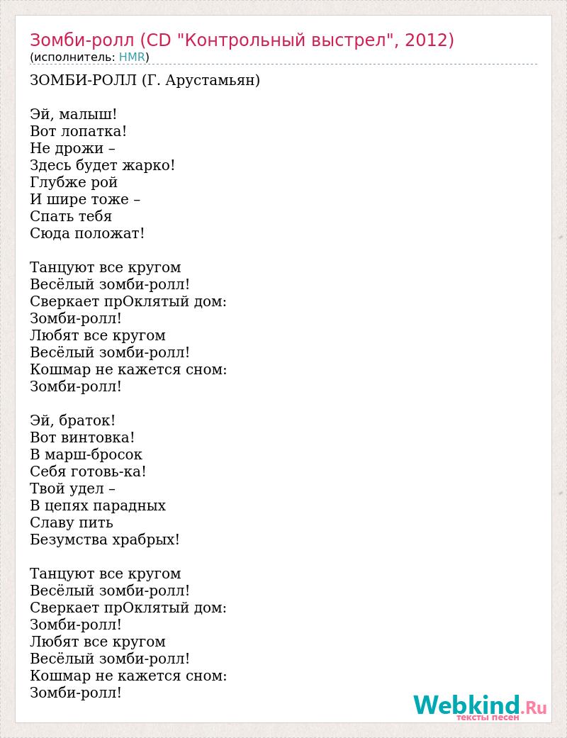 ЗОМБИ-РОЛЛ (Г. Арустамьян) Эй, малыш! Вот лопатка! Не дрожи – Здесь будет жарко! Глубже рой И шире тоже – Спать тебя Сюда положат! Танцуют все кругом Весёлый зомби-ролл! Сверкает прОклятый дом: Зомби-ролл! Любят все кругом Весёлый зомби-ролл! Кошмар не кажется сном: Зомби-ролл! Эй, браток! Вот винтовка! В марш-бросок Себя готовь-ка! Твой удел – В цепях парадных Славу пить Безумства храбрых! Танцуют все кругом Весёлый зомби-ролл! Сверкает прОклятый дом: Зомби-ролл! Любят все кругом Весёлый зомби-ролл! Кошмар не кажется сном: Зомби-ролл!