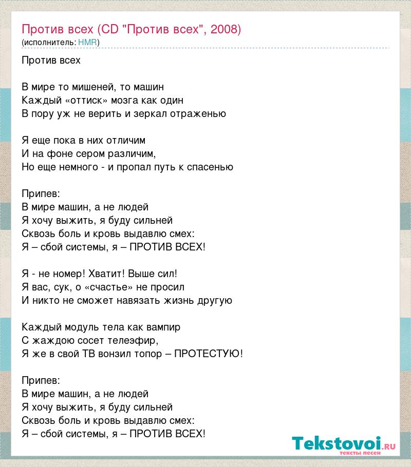 Против всех В мире то мишеней, то машин Каждый «оттиск» мозга как один В пору уж не верить и зеркал отраженью Я еще пока в них отличим И на фоне сером различим, Но еще немного - и пропал путь к спасенью Припев: В мире машин, а не людей Я хочу выжить, я буду сильней Сквозь боль и кровь выдавлю смех: Я – сбой системы, я – ПРОТИВ ВСЕХ! Я - не номер! Хватит! Выше сил! Я вас, сук, о «счастье» не просил И никто не сможет навязать жизнь другую Каждый модуль тела как вампир С жаждою сосет телеэфир, Я же в свой ТВ вонзил топор – ПРОТЕСТУЮ! Припев: В мире машин, а не людей Я хочу выжить, я буду сильней Сквозь боль и кровь выдавлю смех: Я – сбой системы, я – ПРОТИВ ВСЕХ!