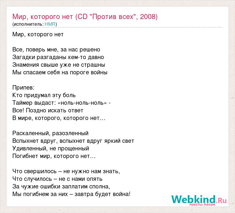 Мир, которого нет Все, поверь мне, за нас решено Загадки разгаданы кем-то давно Знамения свыше уже не страшны Мы спасаем себя на пороге войны Припев: Кто придумал эту боль Таймер выдаст: «ноль-ноль-ноль» - Все! Поздно искать ответ В мире, которого, которого нет… Раскаленный, разозленный Вспыхнет вдруг, вспыхнет вдруг яркий свет Удивленный, не прощенный Погибнет мир, которого нет… Что свершилось – не нужно нам знать, Что случилось – не с нами опять За чужие ошибки заплатим сполна, Мы погибнем за них – завтра будет война!