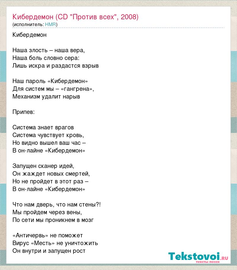 Кибердемон Наша злость – наша вера, Наша боль словно сера: Лишь искра и раздастся взрыв Наш пароль «Кибердемон» Для систем мы – «гангрена», Механизм удалит нарыв Припев: Система знает врагов Система чувствует кровь, Но видно вышел ваш час – В он-лайне «Кибердемон» Запущен сканер идей, Он жаждет новых смертей, Но не пройдет в этот раз – В он-лайне «Кибердемон» Что нам дверь, что нам стены?! Мы пройдем через вены, По сети мы проникнем в мозг «Античервь» не поможет Вирус «Месть» не уничтожить Он внутри и запущен рост