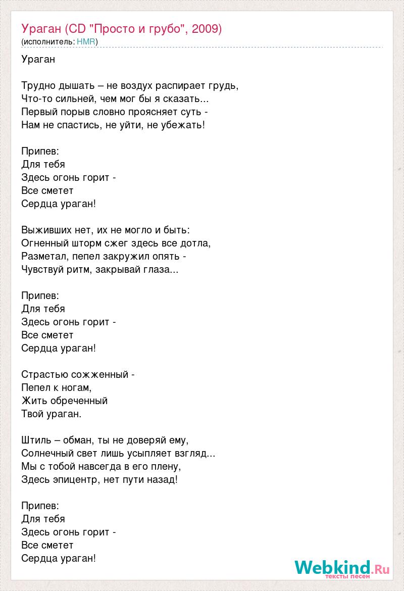 Ураган Трудно дышать – не воздух распирает грудь, Что-то сильней, чем мог бы я сказать... Первый порыв словно проясняет суть - Нам не спастись, не уйти, не убежать! Припев: Для тебя Здесь огонь горит - Все сметет Сердца ураган! Выживших нет, их не могло и быть: Огненный шторм сжег здесь все дотла, Разметал, пепел закружил опять - Чувствуй ритм, закрывай глаза... Припев: Для тебя Здесь огонь горит - Все сметет Сердца ураган! Страстью сожженный - Пепел к ногам, Жить обреченный Твой ураган. Штиль – обман, ты не доверяй ему, Солнечный свет лишь усыпляет взгляд... Мы с тобой навсегда в его плену, Здесь эпицентр, нет пути назад! Припев: Для тебя Здесь огонь горит - Все сметет Сердца ураган!
