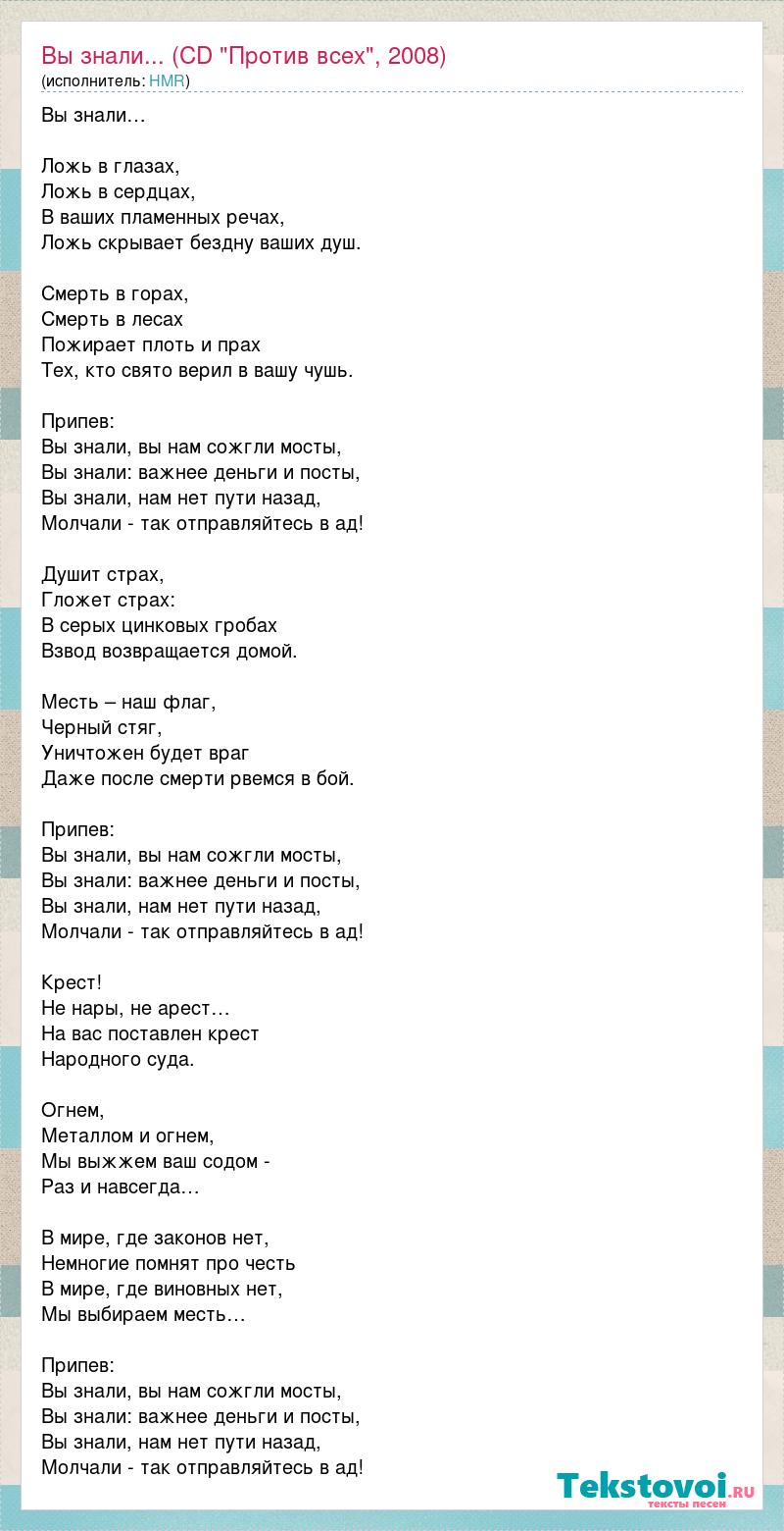 Вы знали… Ложь в глазах, Ложь в сердцах, В ваших пламенных речах, Ложь скрывает бездну ваших душ. Смерть в горах, Смерть в лесах Пожирает плоть и прах Тех, кто свято верил в вашу чушь. Припев: Вы знали, вы нам сожгли мосты, Вы знали: важнее деньги и посты, Вы знали, нам нет пути назад, Молчали - так отправляйтесь в ад! Душит страх, Гложет страх: В серых цинковых гробах Взвод возвращается домой. Месть – наш флаг, Черный стяг, Уничтожен будет враг Даже после смерти рвемся в бой. Припев: Вы знали, вы нам сожгли мосты, Вы знали: важнее деньги и посты, Вы знали, нам нет пути назад, Молчали - так отправляйтесь в ад! Крест! Не нары, не арест… На вас поставлен крест Народного суда. Огнем, Металлом и огнем, Мы выжжем ваш содом - Раз и навсегда… В мире, где законов нет, Немногие помнят про честь В мире, где виновных нет, Мы выбираем месть… Припев: Вы знали, вы нам сожгли мосты, Вы знали: важнее деньги и посты, Вы знали, нам нет пути назад, Молчали - так отправляйтесь в ад!