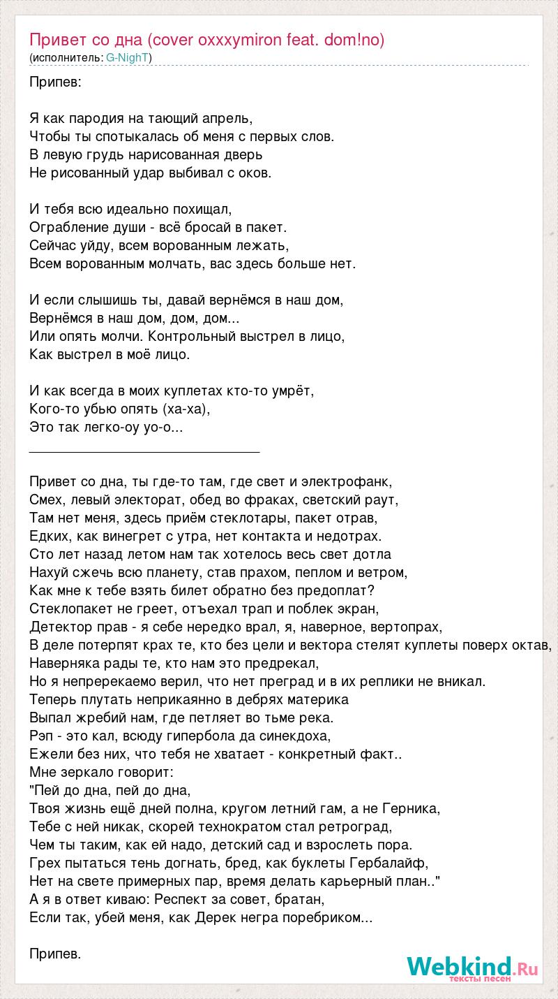 Припев: Я как пародия на тающий апрель, Чтобы ты спотыкалась об меня с первых слов. В левую грудь нарисованная дверь Не рисованный удар выбивал с оков. И тебя всю идеально похищал, Ограбление души - всё бросай в пакет. Сейчас уйду, всем ворованным лежать, Всем ворованным молчать, вас здесь больше нет. И если слышишь ты, давай вернёмся в наш дом, Вернёмся в наш дом, дом, дом... Или опять молчи. Контрольный выстрел в лицо, Как выстрел в моё лицо. И как всегда в моих куплетах кто-то умрёт, Кого-то убью опять (ха-ха), Это так легко-оу уо-о... ______________________________ Привет со дна, ты где-то там, где свет и электрофанк, Смех, левый электорат, обед во фраках, светский раут, Там нет меня, здесь приём стеклотары, пакет отрав, Едких, как винегрет с утра, нет контакта и недотрах. Сто лет назад летом нам так хотелось весь свет дотла Нахуй сжечь всю планету, став прахом, пеплом и ветром, Как мне к тебе взять билет обратно без предоплат? Стеклопакет не греет, отъехал трап и поблек экран, Детектор прав - я себе нередко врал, я, наверное, вертопрах, В деле потерпят крах те, кто без цели и вектора стелят куплеты поверх октав, Наверняка рады те, кто нам это предрекал, Но я непререкаемо верил, что нет преград и в их реплики не вникал. Теперь плутать неприкаянно в дебрях материка Выпал жребий нам, где петляет во тьме река. Рэп - это кал, всюду гипербола да синекдоха, Ежели без них, что тебя не хватает - конкретный факт.. Мне зеркало говорит: "Пей до дна, пей до дна, Твоя жизнь ещё дней полна, кругом летний гам, а не Герника, Тебе с ней никак, скорей технократом стал ретроград, Чем ты таким, как ей надо, детский сад и взрослеть пора. Грех пытаться тень догнать, бред, как буклеты Гербалайф, Нет на свете примерных пар, время делать карьерный план.." А я в ответ киваю: Респект за совет, братан, Если так, убей меня, как Дерек негра поребриком... Припев.