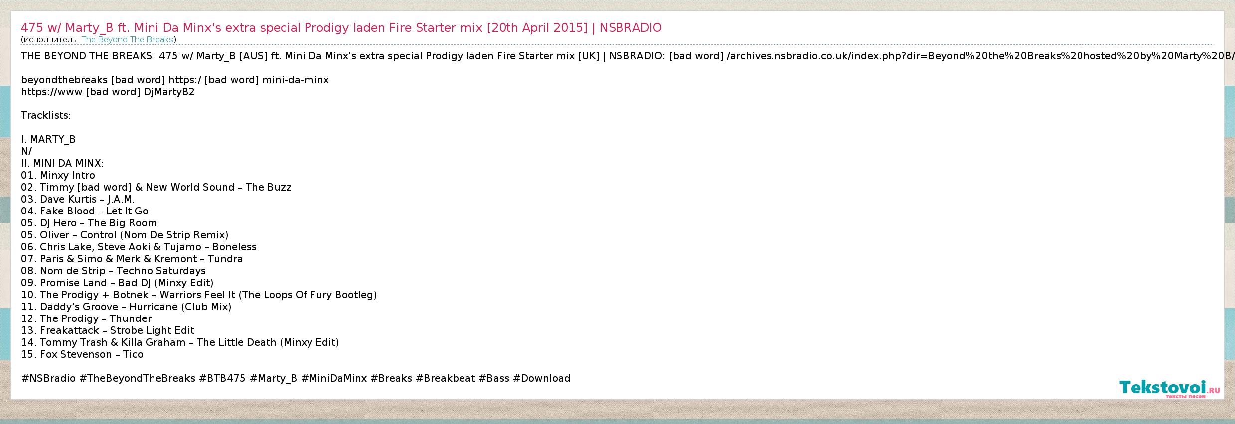 THE BEYOND THE BREAKS: 475 w/ Marty_B [AUS] ft. Mini Da Minx's extra special Prodigy laden Fire Starter mix [UK] | NSBRADIO: [bad word] /archives.nsbradio.co.uk/index.php?dir=Beyond%20the%20Breaks%20hosted%20by%20Marty%20B/ beyondthebreaks [bad word] \nhttps:/ [bad word] mini-da-minx https://www [bad word] DjMartyB2 Tracklists: I. MARTY_B N/ II. MINI DA MINX: 01. Minxy Intro 02. Timmy Trumpet & New World Sound – The Buzz 03. Dave Kurtis – J.A.M. 04. Fake Blood – Let It Go 05. DJ Hero – The Big Room 05. Oliver – Control (Nom De Strip Remix) 06. Chris Lake, Steve Aoki & Tujamo – Boneless 07. Paris & Simo & Merk & Kremont – Tundra 08. Nom de Strip – Techno Saturdays 09. Promise Land – Bad DJ (Minxy Edit) 10. The Prodigy + Botnek – Warriors Feel It (The Loops Of Fury Bootleg) 11. Daddy’s Groove – Hurricane (Club Mix) 12. The Prodigy – Thunder 13. Freakattack – Strobe Light Edit 14. Tommy Trash & Killa Graham – The Little Death (Minxy Edit) 15. Fox Stevenson – Tico #NSBradio #TheBeyondTheBreaks #BTB475 #Marty_B #MiniDaMinx #Breaks #Breakbeat #Bass #Download