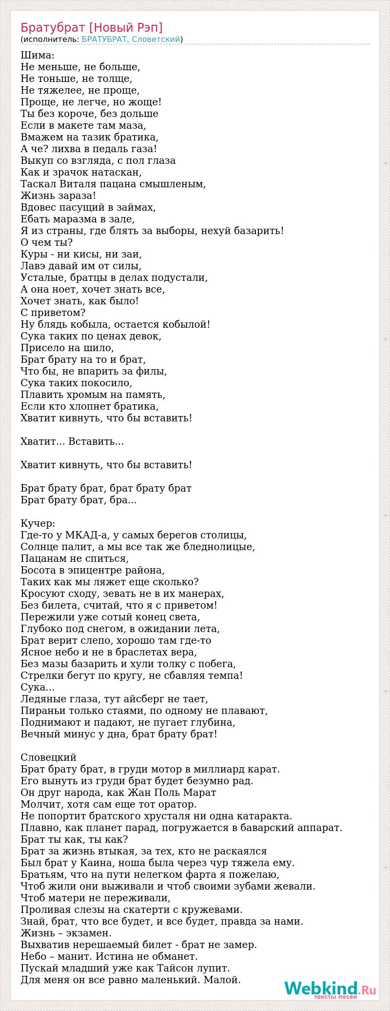 Шима: Не меньше, не больше, Не тоньше, не толще, Не тяжелее, не проще, Проще, не легче, но жоще! Ты без короче, без дольше Если в макете там маза, Вмажем на тазик братика, А че? лихва в педаль газа! Выкуп со взгляда, с пол глаза Как и зрачок натаскан, Таскал Виталя пацана смышленым, Жизнь зараза! Вдовес пасущий в займах, Ебать маразма в зале, Я из страны, где блять за выборы, нехуй базарить! О чем ты? Куры - ни кисы, ни заи, Лавэ давай им от силы, Усталые, братцы в делах подустали, А она ноет, хочет знать все, Хочет знать, как было! С приветом? Ну блядь кобыла, остается кобылой! Сука таких по ценах девок, Присело на шило, Брат брату на то и брат, Что бы, не впарить за филы, Сука таких покосило, Плавить хромым на память, Если кто хлопнет братика, Хватит кивнуть, что бы вставить! Хватит... Вставить... Хватит кивнуть, что бы вставить! Брат брату брат, брат брату брат Брат брату брат, бра... Кучер: Где-то у МКАД-а, у самых берегов столицы, Солнце палит, а мы все так же бледнолицые, Пацанам не спиться, Босота в эпицентре района, Таких как мы ляжет еще сколько? Кросуют сходу, зевать не в их манерах, Без билета, считай, что я с приветом! Пережили уже сотый конец света, Глубоко под снегом, в ожидании лета, Брат верит слепо, хорошо там где-то Ясное небо и не в браслетах вера, Без мазы базарить и хули толку с побега, Стрелки бегут по кругу, не сбавляя темпа! Сука... Ледяные глаза, тут айсберг не тает, Пираньи только стаями, по одному не плавают, Поднимают и падают, не пугает глубина, Вечный минус у дна, брат брату брат! Словецкий Брат брату брат, в груди мотор в миллиард карат. Его вынуть из груди брат будет безумно рад. Он друг народа, как Жан Поль Марат Молчит, хотя сам еще тот оратор. Не попортит братского хрусталя ни одна катаракта. Плавно, как планет парад, погружается в баварский аппарат. Брат ты как, ты как? Брат за жизнь втыкая, за тех, кто не раскаялся Был брат у Каина, ноша была через чур тяжела ему. Братьям, что на пути нелегком фарта я пожелаю, Чтоб жили они выживали и чтоб своими зубами жевали. Чтоб матери не переживали, Проливая слезы на скатерти с кружевами. Знай, брат, что все будет, и все будет, правда за нами. Жизнь – экзамен. Выхватив нерешаемый билет - брат не замер. Небо – манит. Истина не обманет. Пускай младший уже как Тайсон лупит. Для меня он все равно маленький. Малой.