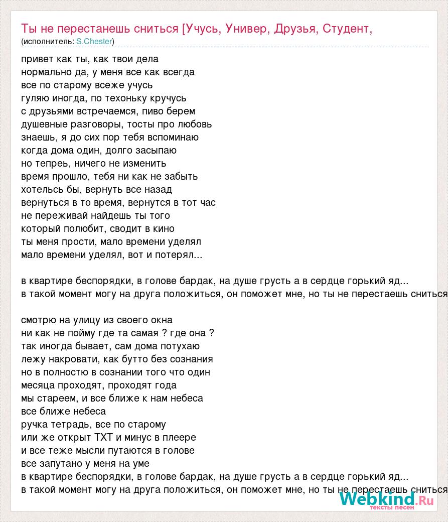 привет как ты, как твои дела нормально да, у меня все как всегда все по старому всеже учусь гуляю иногда, по техоньку кручусь с друзьями встречаемся, пиво берем душевные разговоры, тосты про любовь знаешь, я до сих пор тебя вспоминаю когда дома один, долго засыпаю но тепреь, ничего не изменить время прошло, тебя ни как не забыть хотельсь бы, вернуть все назад вернуться в то время, вернутся в тот час не переживай найдешь ты того который полюбит, сводит в кино ты меня прости, мало времени уделял мало времени уделял, вот и потерял... в квартире беспорядки, в голове бардак, на душе грусть а в сердце горький яд... в такой момент могу на друга положиться, он поможет мне, но ты не перестаешь сниться смотрю на улицу из своего окна ни как не пойму где та самая ? где она ? так иногда бывает, сам дома потухаю лежу накровати, как бутто без сознания но в полностю в сознании того что один месяца проходят, проходят года мы стареем, и все ближе к нам небеса все ближе небеса ручка тетрадь, все по старому или же открыт ТХТ и минус в плеере и все теже мысли путаются в голове все запутано у меня на уме в квартире беспорядки, в голове бардак, на душе грусть а в сердце горький яд... в такой момент могу на друга положиться, он поможет мне, но ты не перестаешь сниться