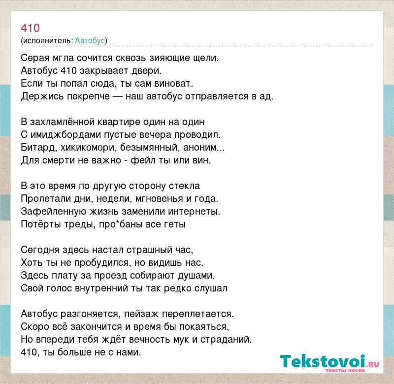 Серая мгла сочится сквозь зияющие щели. Автобус 410 закрывает двери. Если ты попал сюда, ты сам виноват. Держись покрепче — наш автобус отправляется в ад. В захламлённой квартире один на один С имиджбордами пустые вечера проводил. Битард, хикикомори, безымянный, аноним... Для смерти не важно - фейл ты или вин. В это время по другую сторону стекла Пролетали дни, недели, мгновенья и года. Зафейленную жизнь заменили интернеты. Потёрты треды, про*баны все геты Сегодня здесь настал страшный час, Хоть ты не пробудился, но видишь нас. Здесь плату за проезд собирают душами. Свой голос внутренний ты так редко слушал Автобус разгоняется, пейзаж переплетается. Скоро всё закончится и время бы покаяться, Но впереди тебя ждёт вечность мук и страданий. 410, ты больше не с нами.