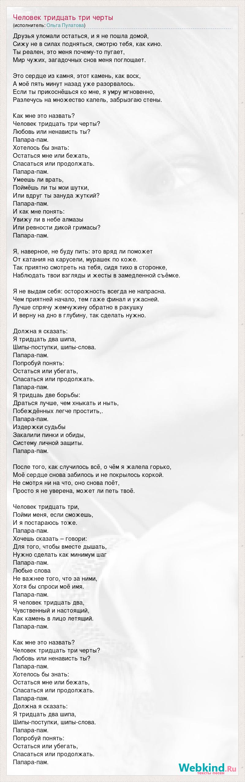 Друзья уломали остаться, и я не пошла домой, Сижу не в силах подняться, смотрю тебя, как кино. Ты реален, это меня почему-то пугает, Мир чужих, загадочных снов меня поглощает. Это сердце из камня, этот камень, как воск, А моё пять минут назад уже разорвалось. Если ты прикоснёшься ко мне, я умру мгновенно, Разлечусь на множество капель, забрызгаю стены. Как мне это назвать? Человек тридцать три черты? Любовь или ненависть ты? Папара-пам. Хотелось бы знать: Остаться мне или бежать, Спасаться или продолжать. Папара-пам. Умеешь ли врать, Поймёшь ли ты мои шутки, Или вдруг ты зануда жуткий? Папара-пам. И как мне понять: Увижу ли в небе алмазы Или ревности дикой гримасы? Папара-пам. Я, наверное, не буду пить: это вряд ли поможет От катания на карусели, мурашек по коже. Так приятно смотреть на тебя, сидя тихо в сторонке, Наблюдать твои взгляды и жесты в замедленной съёмке. Я не выдам себя: осторожность всегда не напрасна. Чем приятней начало, тем гаже финал и ужасней. Лучше спрячу жемчужину обратно в ракушку И верну на дно в глубину, так сделать нужно. Должна я сказать: Я тридцать два шипа, Шипы-поступки, шипы-слова. Папара-пам. Попробуй понять: Остаться или убегать, Спасаться или продолжать. Папара-пам. Я тридцаь две борьбы: Драться лучше, чем хныкать и ныть, Побеждённых легче простить,. Папара-пам. Издержки судьбы Закалили пинки и обиды, Систему личной защиты. Папара-пам. После того, как случилось всё, о чём я жалела горько, Моё сердце снова забилось и не покрылось коркой. Не смотря ни на что, оно снова поёт, Просто я не уверена, может ли петь твоё. Человек тридцать три, Пойми меня, если сможешь, И я постараюсь тоже. Папара-пам. Хочешь сказать – говори: Для того, чтобы вместе дышать, Нужно сделать как минимум шаг Папара-пам. Любые слова Не важнее того, что за ними, Хотя бы спроси моё имя. Папара-пам. Я человек тридцать два, Чувственный и настоящий, Как камень в лицо летящий. Папара-пам. Как мне это назвать? Человек тридцать три черты? Любовь или ненависть ты? Папара-пам. Хотелось бы знать: Остаться мне или бежать, Спасаться или продолжать. Папара-пам. Должна я сказать: Я тридцать два шипа, Шипы-поступки, шипы-слова. Папара-пам. Попробуй понять: Остаться или убегать, Спасаться или продолжать. Папара-пам.