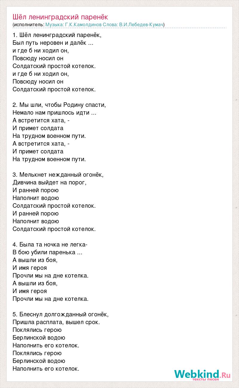 1. Шёл ленинградский паренёк, Был путь неровен и далёк ... и где б ни ходил он, Повсюду носил он Солдатский простой котелок. и где б ни ходил он, Повсюду носил он Солдатский простой котелок. 2. Мы шли, чтобы Родину спасти, Немало нам пришлось идти ... А встретится хата, - И примет солдата На трудном военном пути. А встретится хата, - И примет солдата На трудном военном пути. 3. Мелькнет нежданный огонёк, Дивчина выйдет на порог, И ранней порою Наполнит водою Солдатский простой котелок. И ранней порою Наполнит водою Солдатский простой котелок. 4. Была та ночка не легка- В бою убили паренька ... А вышли из боя, И имя героя Прочли мы на дне котелка. А вышли из боя, И имя героя Прочли мы на дне котелка. 5. Блеснул долгожданный огонёк, Пришла расплата, вышел срок. Поклялись герою Берлинской водою Наполнить его котелок. Поклялись герою Берлинской водою Наполнить его котелок.