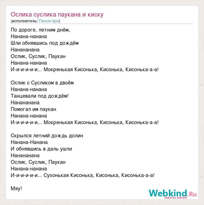 По дороге, летним днём, Нанана-нанана Шли обнявшись под дождём Нанананана Ослик, Суслик, Паукан Нанана-нанана И-и-и-и-и-и... Мокренькая Кисонька, Кисонька, Кисонька-а-а! Ослик с Сусликом в двоём Нанана-нанана Танцевали под дождём! Нанананана Помогал им паукан Нанана-нанана И-и-и-и-и-и... Мокренькая Кисонька, Кисонька, Кисонька-а-а! Скрылся летний дождь долин Нанана-Нанана И обнявшись в даль ушли Нанананана Ослик, Суслик, Паукан Нанана-нанана И-и-и-и-и-и... Сухонькая Кисонька, Кисонька, Кисонька-а-а! Мяу!