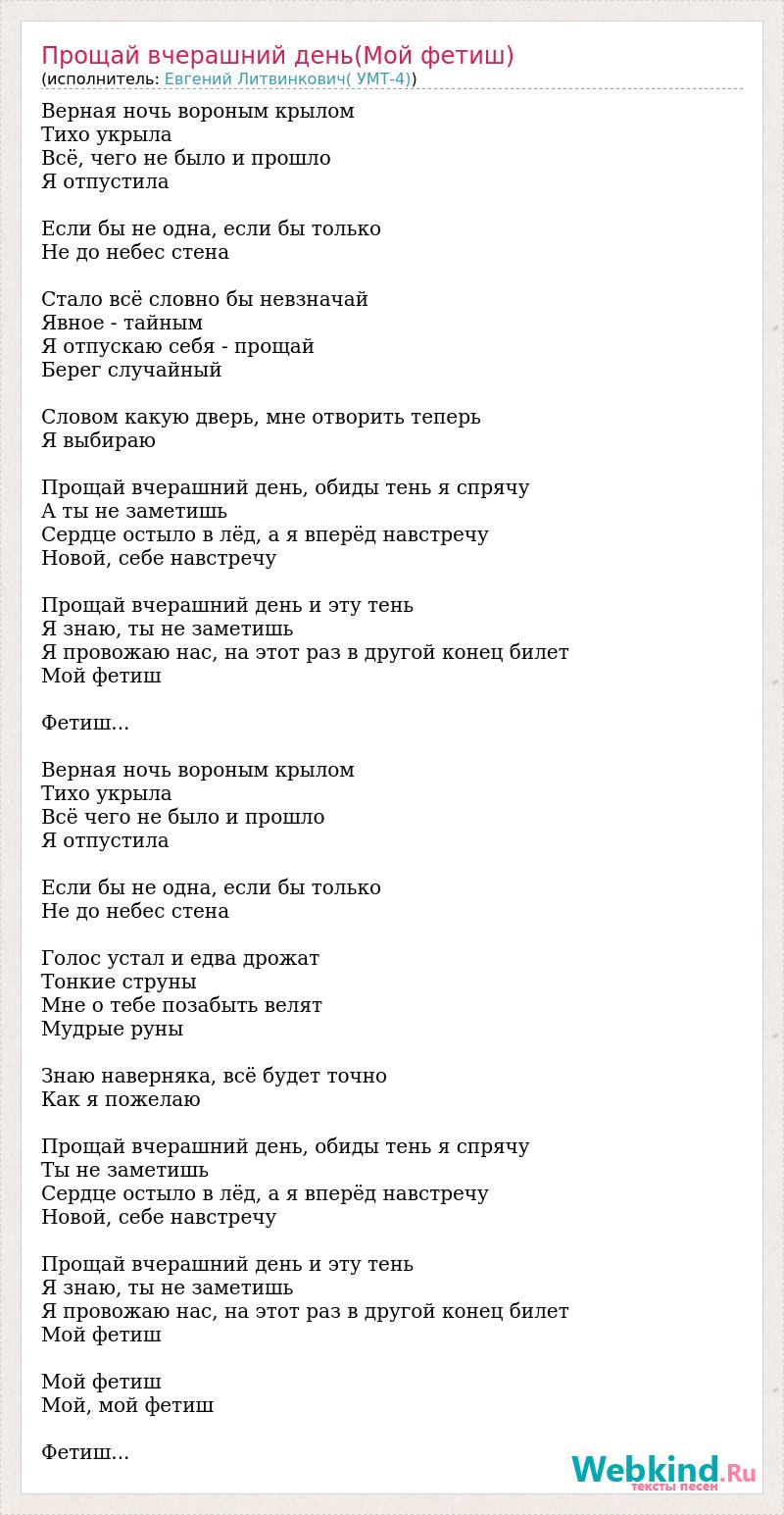 Верная ночь вороным крылом Тихо укрыла Всё, чего не было и прошло Я отпустила Если бы не одна, если бы только Не до небес стена Стало всё словно бы невзначай Явное - тайным Я отпускаю себя - прощай Берег случайный Словом какую дверь, мне отворить теперь Я выбираю Прощай вчерашний день, обиды тень я спрячу А ты не заметишь Сердце остыло в лёд, а я вперёд навстречу Новой, себе навстречу Прощай вчерашний день и эту тень Я знаю, ты не заметишь Я провожаю нас, на этот раз в другой конец билет Мой фетиш Фетиш... Верная ночь вороным крылом Тихо укрыла Всё чего не было и прошло Я отпустила Если бы не одна, если бы только Не до небес стена Голос устал и едва дрожат Тонкие струны Мне о тебе позабыть велят Мудрые руны Знаю наверняка, всё будет точно Как я пожелаю Прощай вчерашний день, обиды тень я спрячу Ты не заметишь Сердце остыло в лёд, а я вперёд навстречу Новой, себе навстречу Прощай вчерашний день и эту тень Я знаю, ты не заметишь Я провожаю нас, на этот раз в другой конец билет Мой фетиш Мой фетиш Мой, мой фетиш Фетиш...