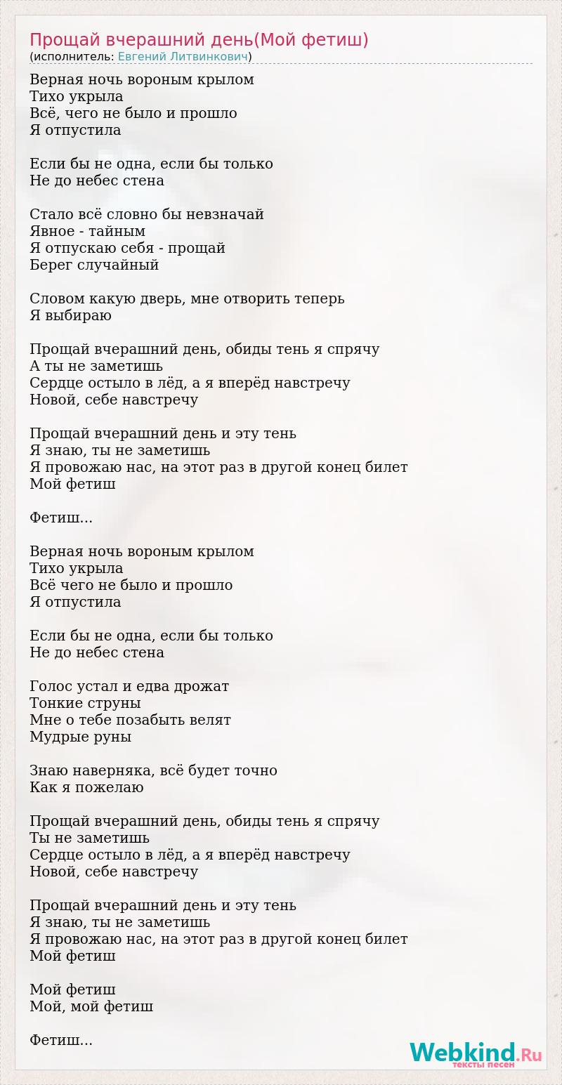 Верная ночь вороным крылом Тихо укрыла Всё, чего не было и прошло Я отпустила Если бы не одна, если бы только Не до небес стена Стало всё словно бы невзначай Явное - тайным Я отпускаю себя - прощай Берег случайный Словом какую дверь, мне отворить теперь Я выбираю Прощай вчерашний день, обиды тень я спрячу А ты не заметишь Сердце остыло в лёд, а я вперёд навстречу Новой, себе навстречу Прощай вчерашний день и эту тень Я знаю, ты не заметишь Я провожаю нас, на этот раз в другой конец билет Мой фетиш Фетиш... Верная ночь вороным крылом Тихо укрыла Всё чего не было и прошло Я отпустила Если бы не одна, если бы только Не до небес стена Голос устал и едва дрожат Тонкие струны Мне о тебе позабыть велят Мудрые руны Знаю наверняка, всё будет точно Как я пожелаю Прощай вчерашний день, обиды тень я спрячу Ты не заметишь Сердце остыло в лёд, а я вперёд навстречу Новой, себе навстречу Прощай вчерашний день и эту тень Я знаю, ты не заметишь Я провожаю нас, на этот раз в другой конец билет Мой фетиш Мой фетиш Мой, мой фетиш Фетиш...