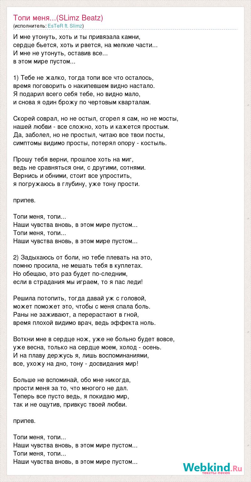 И мне утонуть, хоть и ты привязала камни, сердце бьется, хоть и рвется, на мелкие части... И мне не утонуть, оставив все... в этом мире пустом... 1) Тебе не жалко, тогда топи все что осталось, время поговорить о накипевшем видно настало. Я подарил всего себя тебе, но видно мало, и снова я один брожу по чертовым кварталам. Скорей соврал, но не остыл, сгорел я сам, но не мосты, нашей любви - все сложно, хоть и кажется простым. Да, заболел, но не простыл, читаю все твои посты, симптомы видимо просты, потерял опору - костыль. Прошу тебя верни, прошлое хоть на миг, ведь не сравняться они, с другими, сотнями. Вернись и обними, стоит все упростить, я погружаюсь в глубину, уже тону прости. припев. Топи меня, топи... Наши чувства вновь, в этом мире пустом... Топи меня, топи... Наши чувства вновь, в этом мире пустом... 2) Задыхаюсь от боли, но тебе плевать на это, помню просила, не мешать тебя в куплетах. Но обещаю, это раз будет по-следним, если в страдания мы играем, то я пас леди! Решила потопить, тогда давай уж с головой, может поможет это, чтобы с меня спала боль. Раны не заживают, а перерастают в гной, время плохой видимо врач, ведь эффекта ноль. Воткни мне в сердце нож, уже не больно будет вовсе, уже весна, только на сердце моем, холод - осень. И на плаву держусь я, лишь воспоминаниями, все, ухожу на дно, тону - досвидания мир! Больше не вспоминай, обо мне никогда, прости меня за то, что многого не дал. Теперь все пусто ведь, я покидаю мир, так и не ощутив, привкус твоей любви. припев. Топи меня, топи... Наши чувства вновь, в этом мире пустом... Топи меня, топи... Наши чувства вновь, в этом мире пустом...