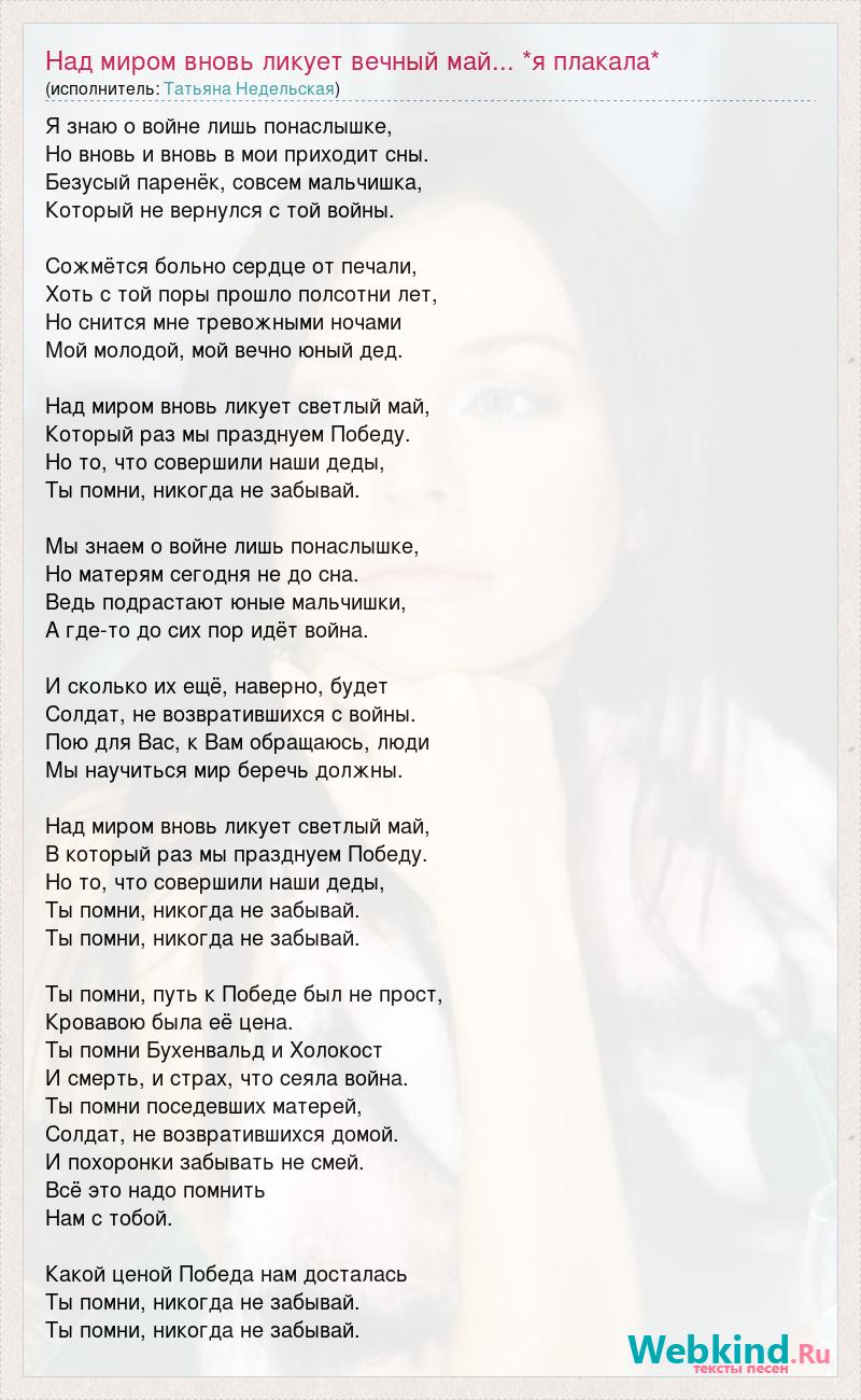 Я знаю о войне лишь понаслышке, Но вновь и вновь в мои приходит сны. Безусый паренёк, совсем мальчишка, Который не вернулся с той войны. Сожмётся больно сердце от печали, Хоть с той поры прошло полсотни лет, Но снится мне тревожными ночами Мой молодой, мой вечно юный дед. Над миром вновь ликует светлый май, Который раз мы празднуем Победу. Но то, что совершили наши деды, Ты помни, никогда не забывай. Мы знаем о войне лишь понаслышке, Но матерям сегодня не до сна. Ведь подрастают юные мальчишки, А где-то до сих пор идёт война. И сколько их ещё, наверно, будет Солдат, не возвратившихся с войны. Пою для Вас, к Вам обращаюсь, люди Мы научиться мир беречь должны. Над миром вновь ликует светлый май, В который раз мы празднуем Победу. Но то, что совершили наши деды, Ты помни, никогда не забывай. Ты помни, никогда не забывай. Ты помни, путь к Победе был не прост, Кровавою была её цена. Ты помни Бухенвальд и Холокост И смерть, и страх, что сеяла война. Ты помни поседевших матерей, Солдат, не возвратившихся домой. И похоронки забывать не смей. Всё это надо помнить Нам с тобой. Какой ценой Победа нам досталась Ты помни, никогда не забывай. Ты помни, никогда не забывай.