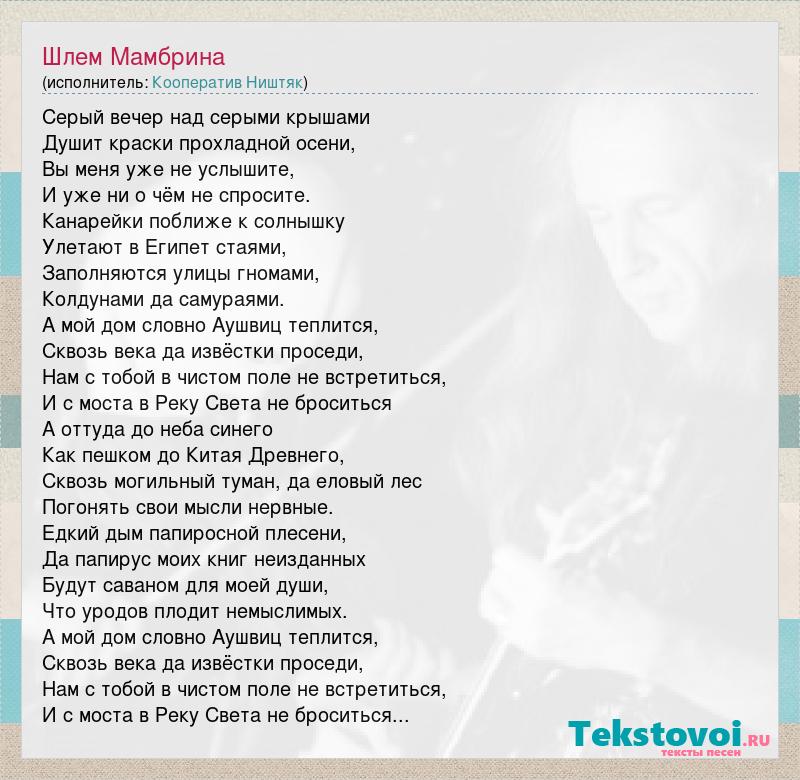 Серый вечер над серыми крышами Душит краски прохладной осени, Вы меня уже не услышите, И уже ни о чём не спросите. Канарейки поближе к солнышку Улетают в Египет стаями, Заполняются улицы гномами, Колдунами да самураями. А мой дом словно Аушвиц теплится, Сквозь века да извёстки проседи, Нам с тобой в чистом поле не встретиться, И с моста в Реку Света не броситься А оттуда до неба синего Как пешком до Китая Древнего, Сквозь могильный туман, да еловый лес Погонять свои мысли нервные. Едкий дым папиросной плесени, Да папирус моих книг неизданных Будут саваном для моей души, Что уродов плодит немыслимых. А мой дом словно Аушвиц теплится, Сквозь века да извёстки проседи, Нам с тобой в чистом поле не встретиться, И с моста в Реку Света не броситься...