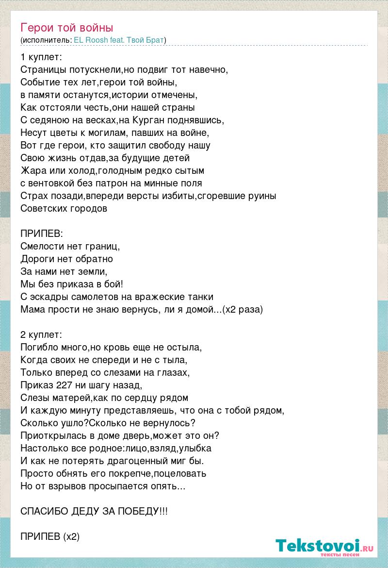1 куплет: Страницы потускнели,но подвиг тот навечно, Событие тех лет,герои той войны, в памяти останутся,истории отмечены, Как отстояли честь,они нашей страны С седяною на весках,на Курган поднявшись, Несут цветы к могилам, павших на войне, Вот где герои, кто защитил свободу нашу Свою жизнь отдав,за будущие детей Жара или холод,голодным редко сытым с вентовкой без патрон на минные поля Страх позади,впереди версты избиты,сгоревшие руины Советских городов ПРИПЕВ: Смелости нет границ, Дороги нет обратно За нами нет земли, Мы без приказа в бой! С эскадры самолетов на вражеские танки Мама прости не знаю вернусь, ли я домой...(x2 раза) 2 куплет: Погибло много,но кровь еще не остыла, Когда своих не спереди и не с тыла, Только вперед со слезами на глазах, Приказ 227 ни шагу назад, Слезы матерей,как по сердцу рядом И каждую минуту представляешь, что она с тобой рядом, Сколько ушло?Сколько не вернулось? Приоткрылась в доме дверь,может это он? Настолько все родное:лицо,взляд,улыбка И как не потерять драгоценный миг бы. Просто обнять его покрепче,поцеловать Но от взрывов просыпается опять... СПАСИБО ДЕДУ ЗА ПОБЕДУ!!! ПРИПЕВ (х2)