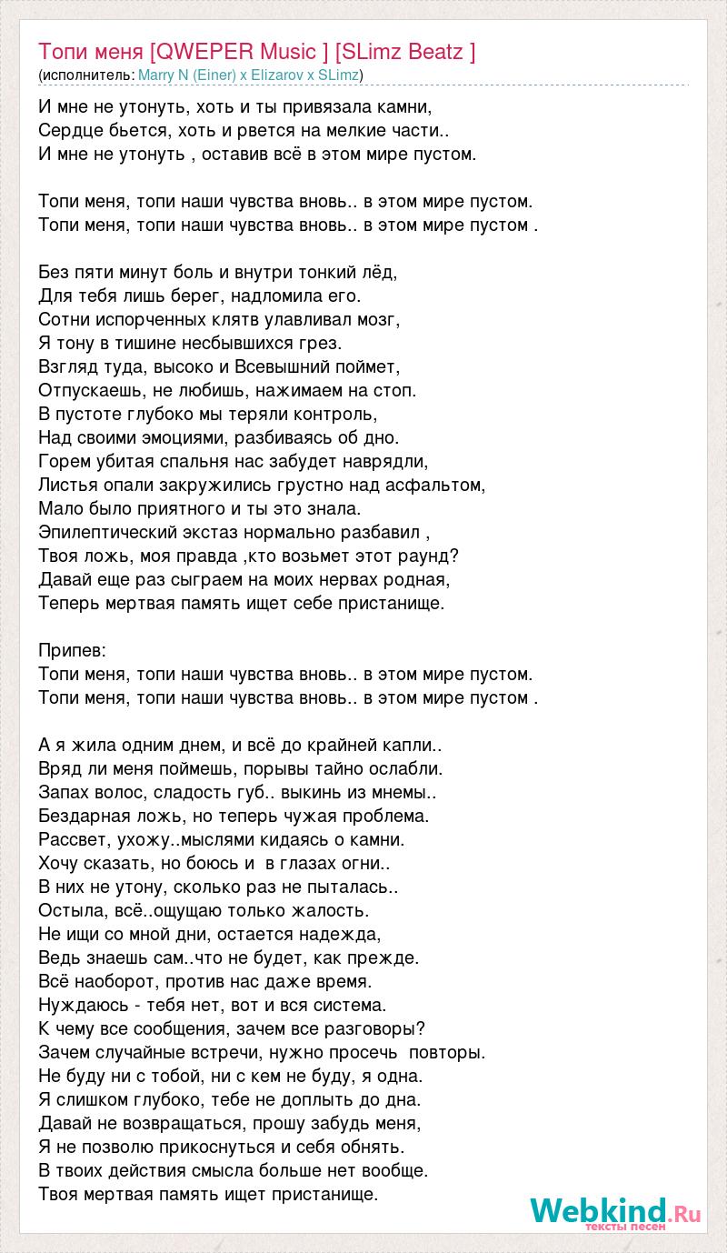 И мне не утонуть, хоть и ты привязала камни, Сердце бьется, хоть и рвется на мелкие части.. И мне не утонуть , оставив всё в этом мире пустом. Топи меня, топи наши чувства вновь.. в этом мире пустом. Топи меня, топи наши чувства вновь.. в этом мире пустом . Без пяти минут боль и внутри тонкий лёд, Для тебя лишь берег, надломила его. Сотни испорченных клятв улавливал мозг, Я тону в тишине несбывшихся грез. Взгляд туда, высоко и Всевышний поймет, Отпускаешь, не любишь, нажимаем на стоп. В пустоте глубоко мы теряли контроль, Над своими эмоциями, разбиваясь об дно. Горем убитая спальня нас забудет наврядли, Листья опали закружились грустно над асфальтом, Мало было приятного и ты это знала. Эпилептический экстаз нормально разбавил , Твоя ложь, моя правда ,кто возьмет этот раунд? Давай еще раз сыграем на моих нервах родная, Теперь мертвая память ищет себе пристанище. Припев: Топи меня, топи наши чувства вновь.. в этом мире пустом. Топи меня, топи наши чувства вновь.. в этом мире пустом . А я жила одним днем, и всё до крайней капли.. Вряд ли меня поймешь, порывы тайно ослабли. Запах волос, сладость губ.. выкинь из мнемы.. Бездарная ложь, но теперь чужая проблема. Рассвет, ухожу..мыслями кидаясь о камни. Хочу сказать, но боюсь и в глазах огни.. В них не утону, сколько раз не пыталась.. Остыла, всё..ощущаю только жалость. Не ищи со мной дни, остается надежда, Ведь знаешь сам..что не будет, как прежде. Всё наоборот, против нас даже время. Нуждаюсь - тебя нет, вот и вся система. К чему все сообщения, зачем все разговоры? Зачем случайные встречи, нужно просечь повторы. Не буду ни с тобой, ни с кем не буду, я одна. Я слишком глубоко, тебе не доплыть до дна. Давай не возвращаться, прошу забудь меня, Я не позволю прикоснуться и себя обнять. В твоих действия смысла больше нет вообще. Твоя мертвая память ищет пристанище.