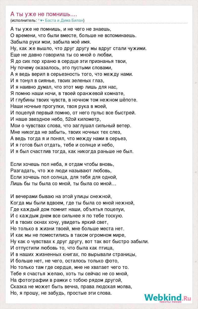 А ты уже не помнишь, и не чего не знаешь, О времени, что были вместе, больше не вспоминаешь. Забыла руки мои, забыла моё имя. Ну, как же вышло, что друг другу мы вдруг стали чужими. Еще не давно говорила ты со мной о любви, Я до сих пор храню в сердце эти признанья твои, Ну почему оказалось, это пустыми словами, А я ведь верил в серьезность того, что между нами. И я тонул в сиянье, твоих зеленых глаз, И я наивно думал, что этот мир лишь для нас, Я помню наши ночи, в твоей оранжевой комнате, И глубины твоих чувств, в ночном том нежном шёпоте. Наши ночные прогулки, твоя рука в моей, И поцелуй первый помню, от него пульс все быстрей. И наше звездное небо, 52ой километр, Мои о чувствах слова, что заглушал сильный ветер. Мне никогда не забыть, твоих ночных тех слез, А ведь тогда я и понял, что между нами в серьез, И я готов был отдать, тебе и солнце и небо, И я был счастлив тогда, как никогда раньше не был. Если хочешь пол неба, я отдам чтобы вновь, Разгадать, что же люди называют любовь, Если хочешь пол солнца, для тебя для одной, Лишь бы ты была со мной, ты была со мной… И вечерами бываю на этой улицы снежной, Когда мы были вдвоем, где ты была со мной нежной, Где каждый дом помнит наши, объятья поцелуи, И с каждым днем все сильнее я по тебе тоскую. И в твоих окнах хочу, увидеть яркий свет, Но только в жизни твоей, мне больше места нет. И как мы не поместились в таком огромном мире, Ну как о чувствах к друг другу, вот так вот быстро забыли. И отпустили любовь то, что была как птица, И в наших жизненных книгах, по вырывали страницы, И больше нет, не чего, осталось только фото, Но только там где сердце, мне не хватает чего то. Тебе я счастья желаю, хоть ты сейчас не со мной, На фотографии в рамки с тобою рядом другой, Сказка не может быть вечна, права людская молва, Но, я прошу, не забудь, простые эти слова.
