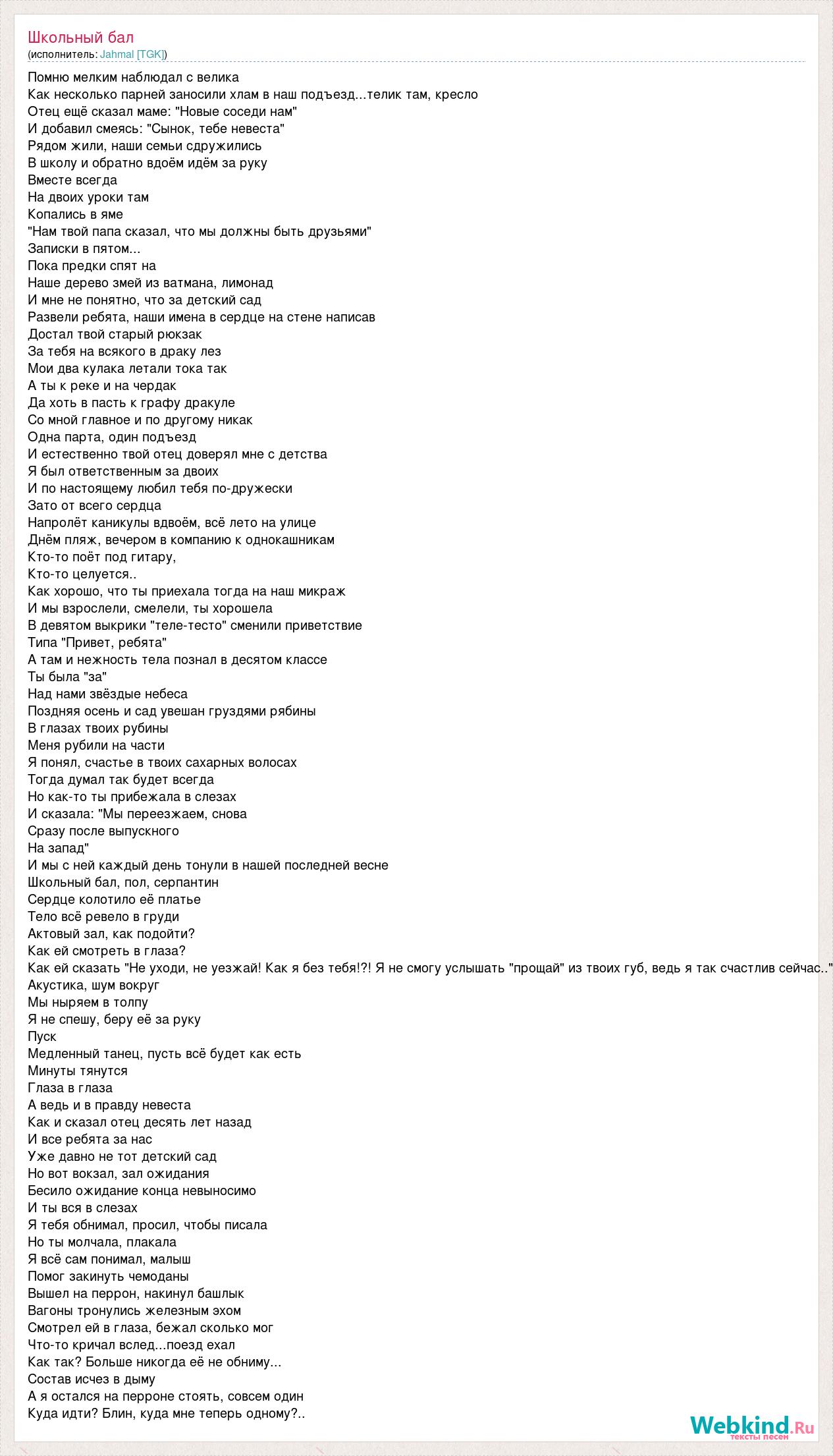 Помню мелким наблюдал с велика Как несколько парней заносили хлам в наш подъезд...телик там, кресло Отец ещё сказал маме: "Новые соседи нам" И добавил смеясь: "Сынок, тебе невеста" Рядом жили, наши семьи сдружились В школу и обратно вдоём идём за руку Вместе всегда На двоих уроки там Копались в яме "Нам твой папа сказал, что мы должны быть друзьями" Записки в пятом... Пока предки спят на Наше дерево змей из ватмана, лимонад И мне не понятно, что за детский сад Развели ребята, наши имена в сердце на стене написав Достал твой старый рюкзак За тебя на всякого в драку лез Мои два кулака летали тока так А ты к реке и на чердак Да хоть в пасть к графу дракуле Со мной главное и по другому никак Одна парта, один подъезд И естественно твой отец доверял мне с детства Я был ответственным за двоих И по настоящему любил тебя по-дружески Зато от всего сердца Напролёт каникулы вдвоём, всё лето на улице Днём пляж, вечером в компанию к однокашникам Кто-то поёт под гитару, Кто-то целуется.. Как хорошо, что ты приехала тогда на наш микраж И мы взрослели, смелели, ты хорошела В девятом выкрики "теле-тесто" сменили приветствие Типа "Привет, ребята" А там и нежность тела познал в десятом классе Ты была "за" Над нами звёздые небеса Поздняя осень и сад увешан груздями рябины В глазах твоих рубины Меня рубили на части Я понял, счастье в твоих сахарных волосах Тогда думал так будет всегда Но как-то ты прибежала в слезах И сказала: "Мы переезжаем, снова Сразу после выпускного На запад" И мы с ней каждый день тонули в нашей последней весне Школьный бал, пол, серпантин Сердце колотило её платье Тело всё ревело в груди Актовый зал, как подойти? Как ей смотреть в глаза? Как ей сказать "Не уходи, не уезжай! Как я без тебя!?! Я не смогу услышать "прощай" из твоих губ, ведь я так счастлив сейчас.." Акустика, шум вокруг Мы ныряем в толпу Я не спешу, беру её за руку Пуск Медленный танец, пусть всё будет как есть Минуты тянутся Глаза в глаза А ведь и в правду невеста Как и сказал отец десять лет назад И все ребята за нас Уже давно не тот детский сад Но вот вокзал, зал ожидания Бесило ожидание конца невыносимо И ты вся в слезах Я тебя обнимал, просил, чтобы писала Но ты молчала, плакала Я всё сам понимал, малыш Помог закинуть чемоданы Вышел на перрон, накинул башлык Вагоны тронулись железным эхом Смотрел ей в глаза, бежал сколько мог Что-то кричал вслед...поезд ехал Как так? Больше никогда её не обниму... Состав исчез в дыму А я остался на перроне стоять, совсем один Куда идти? Блин, куда мне теперь одному?..