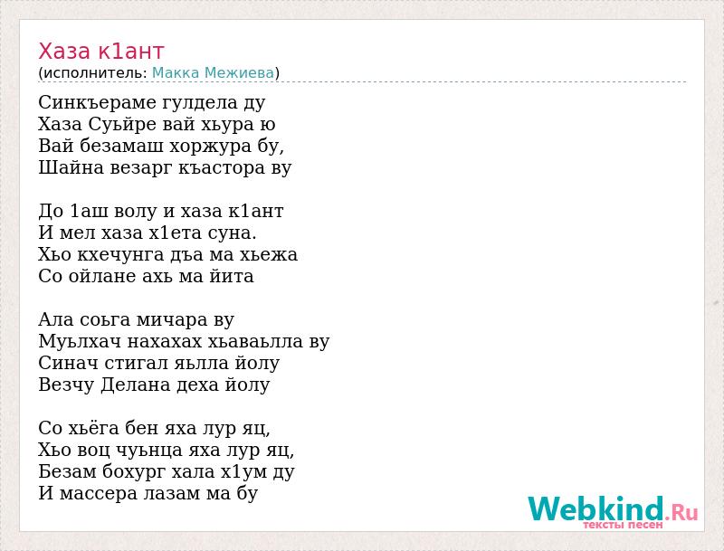 Синкъераме гулдела ду Хаза Суьйре вай хьура ю Вай безамаш хоржура бу, Шайна везарг къастора ву До 1аш волу и хаза к1ант И мел хаза х1ета суна. Хьо кхечунга дъа ма хьежа Со ойлане ахь ма йита Ала соьга мичара ву Муьлхач нахахах хьаваьлла ву Синач стигал яьлла йолу Везчу Делана деха йолу Со хьёга бен яха лур яц, Хьо воц чуьнца яха лур яц, Безам бохург хала х1ум ду И массера лазам ма бу