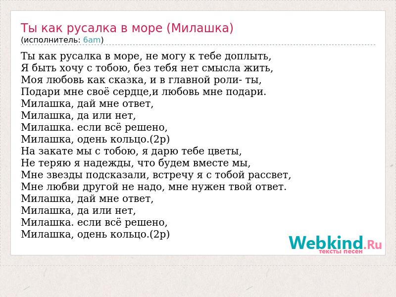 Ты как русалка в море, не могу к тебе доплыть, Я быть хочу с тобою, без тебя нет смысла жить, Моя любовь как сказка, и в главной роли- ты, Подари мне своё сердце,и любовь мне подари. Милашка, дай мне ответ, Милашка, да или нет, Милашка. если всё решено, Милашка, одень кольцо.(2р) На закате мы с тобою, я дарю тебе цветы, Не теряю я надежды, что будем вместе мы, Мне звезды подсказали, встречу я с тобой рассвет, Мне любви другой не надо, мне нужен твой ответ. Милашка, дай мне ответ, Милашка, да или нет, Милашка. если всё решено, Милашка, одень кольцо.(2р)