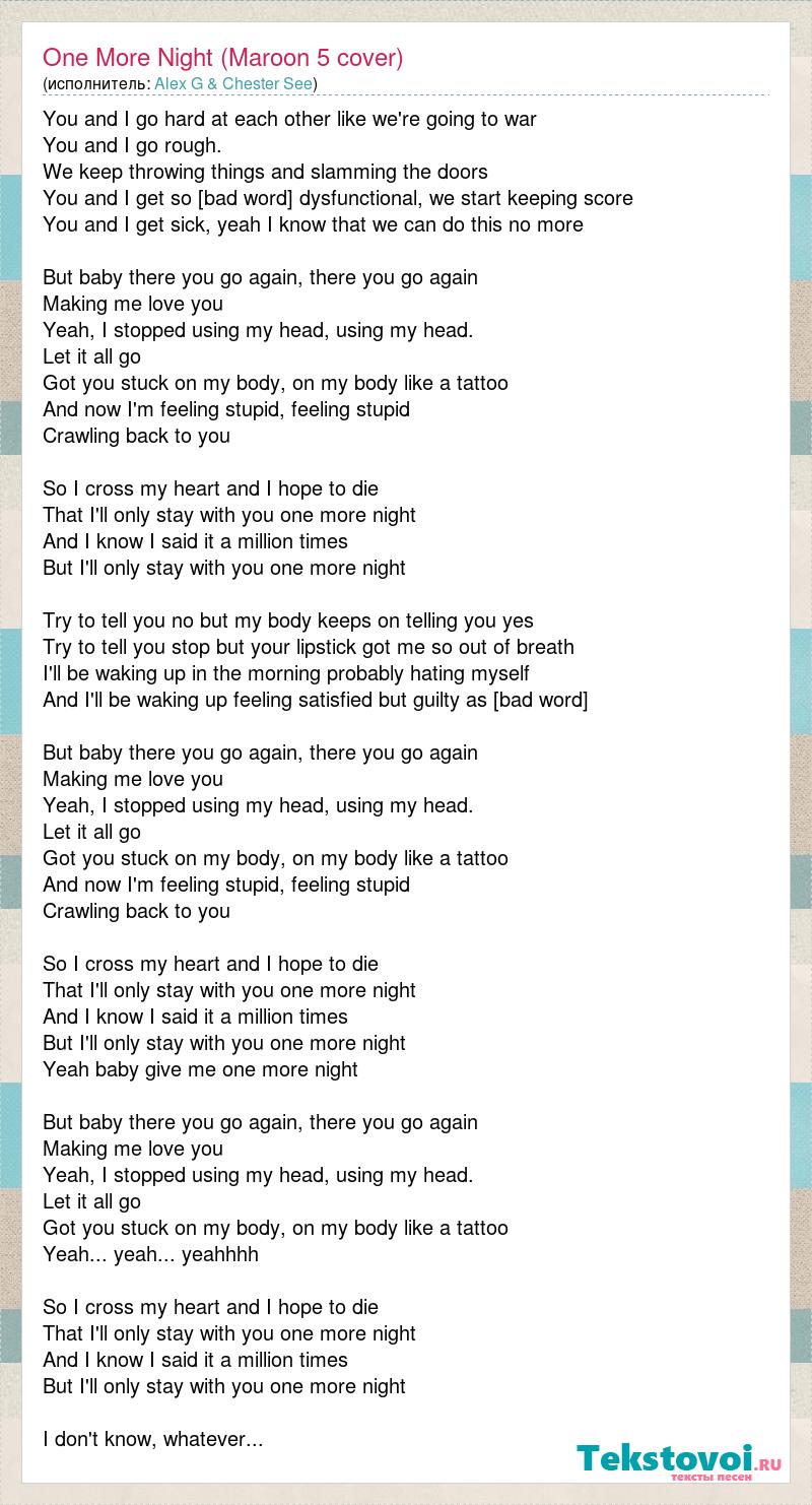 You and I go hard at each other like we're going to war You and I go rough. We keep throwing things and slamming the doors You and I get so [bad word] dysfunctional, we start keeping score You and I get sick, yeah I know that we can do this no more But baby there you go again, there you go again Making me love you Yeah, I stopped using my head, using my head. Let it all go Got you stuck on my body, on my body like a tattoo And now I'm feeling stupid, feeling stupid Crawling back to you So I cross my heart and I hope to die That I'll only stay with you one more night And I know I said it a million times But I'll only stay with you one more night Try to tell you no but my body keeps on telling you yes Try to tell you stop but your lipstick got me so out of breath I'll be waking up in the morning probably hating myself And I'll be waking up feeling satisfied but guilty as [bad word] But baby there you go again, there you go again Making me love you Yeah, I stopped using my head, using my head. Let it all go Got you stuck on my body, on my body like a tattoo And now I'm feeling stupid, feeling stupid Crawling back to you So I cross my heart and I hope to die That I'll only stay with you one more night And I know I said it a million times But I'll only stay with you one more night Yeah baby give me one more night But baby there you go again, there you go again Making me love you Yeah, I stopped using my head, using my head. Let it all go Got you stuck on my body, on my body like a tattoo Yeah... yeah... yeahhhh So I cross my heart and I hope to die That I'll only stay with you one more night And I know I said it a million times But I'll only stay with you one more night I don't know, whatever...