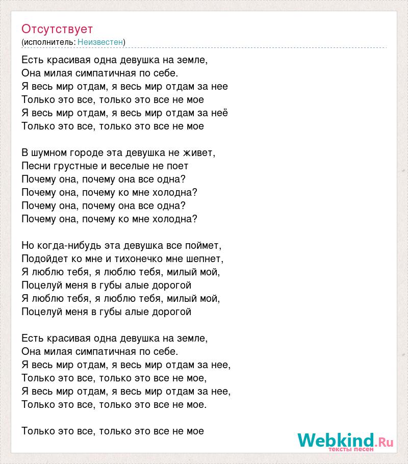 Есть красивая одна девушка на земле, Она милая симпатичная по себе. Я весь мир отдам, я весь мир отдам за нее Только это все, только это все не мое Я весь мир отдам, я весь мир отдам за неё Только это все, только это все не мое В шумном городе эта девушка не живет, Песни грустные и веселые не поет Почему она, почему она все одна? Почему она, почему ко мне холодна? Почему она, почему она все одна? Почему она, почему ко мне холодна? Но когда-нибудь эта девушка все поймет, Подойдет ко мне и тихонечко мне шепнет, Я люблю тебя, я люблю тебя, милый мой, Поцелуй меня в губы алые дорогой Я люблю тебя, я люблю тебя, милый мой, Поцелуй меня в губы алые дорогой Есть красивая одна девушка на земле, Она милая симпатичная по себе. Я весь мир отдам, я весь мир отдам за нее, Только это все, только это все не мое, Я весь мир отдам, я весь мир отдам за нее, Только это все, только это все не мое. Только это все, только это все не мое