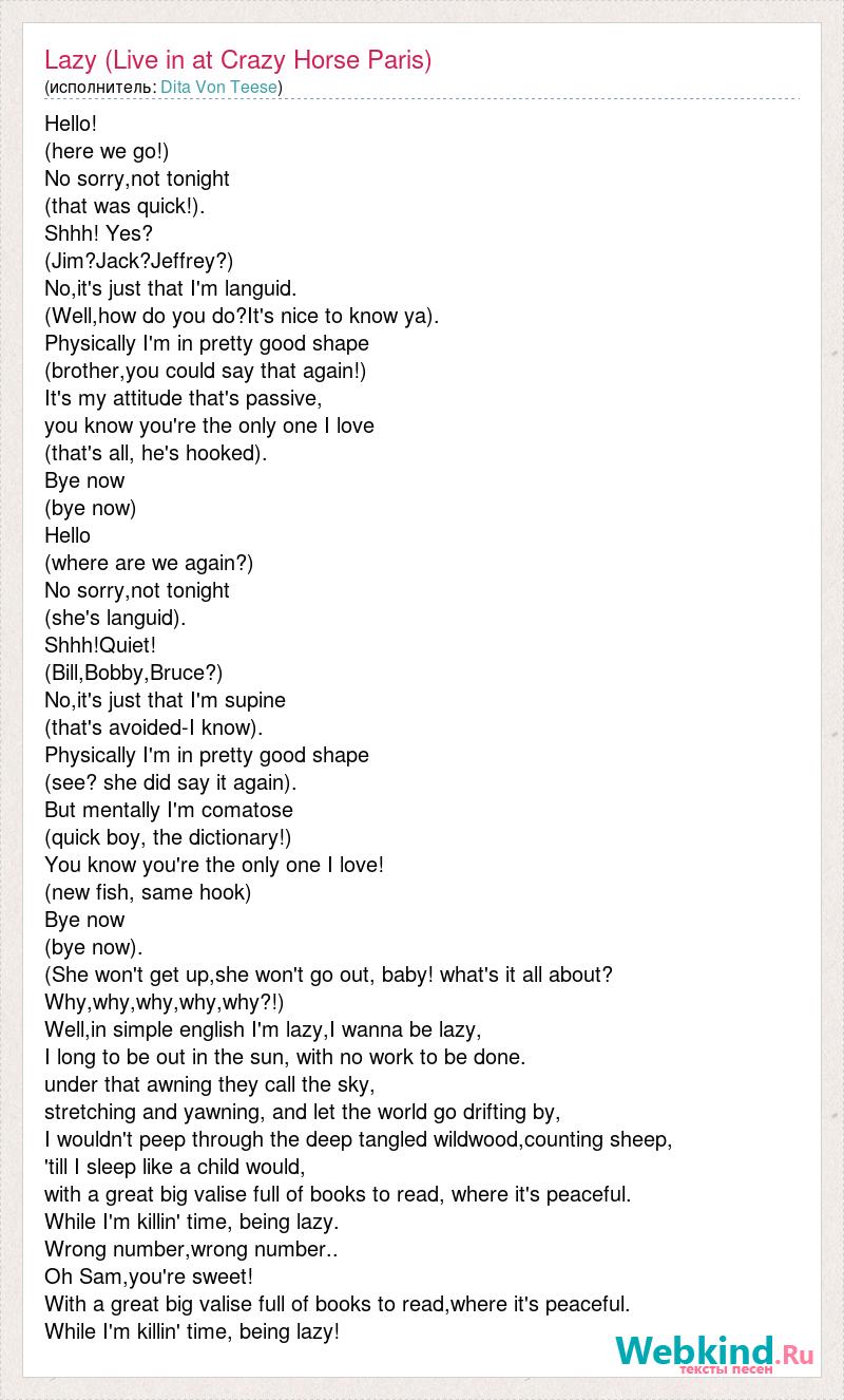 А как ты думаешь, о чем песня "Lazy (Live in at Crazy Horse Paris)" ?