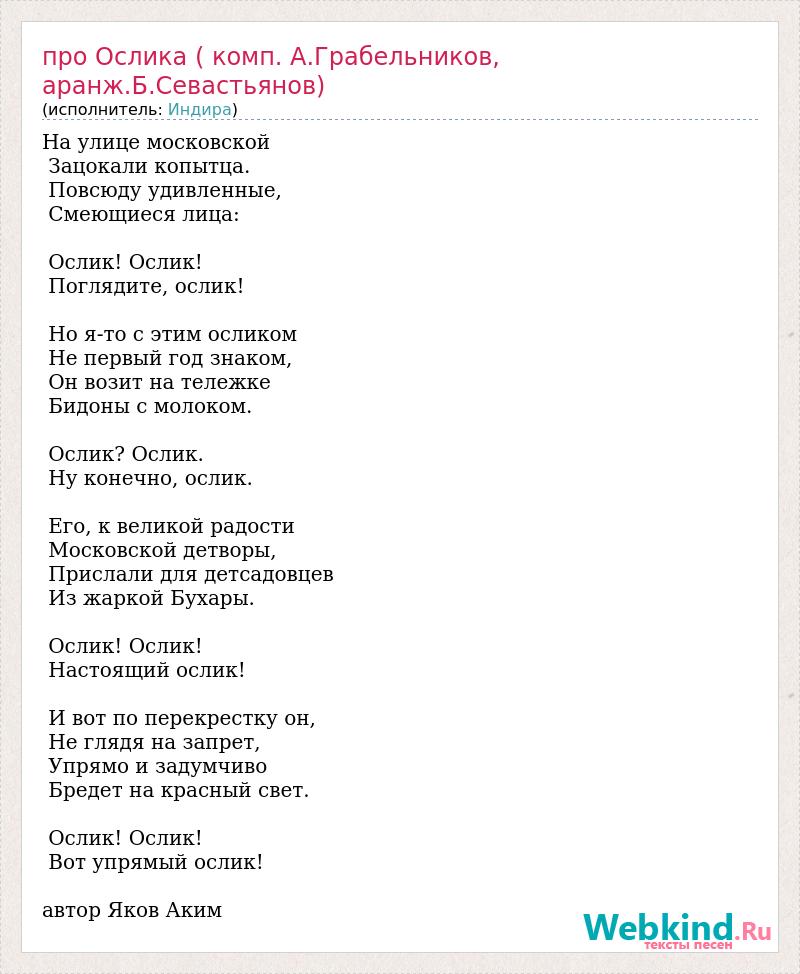На улице московской Зацокали копытца. Повсюду удивленные, Смеющиеся лица: Ослик! Ослик! Поглядите, ослик! Но я-то с этим осликом Не первый год знаком, Он возит на тележке Бидоны с молоком. Ослик? Ослик. Ну конечно, ослик. Его, к великой радости Московской детворы, Прислали для детсадовцев Из жаркой Бухары. Ослик! Ослик! Настоящий ослик! И вот по перекрестку он, Не глядя на запрет, Упрямо и задумчиво Бредет на красный свет. Ослик! Ослик! Вот упрямый ослик! автор Яков Аким