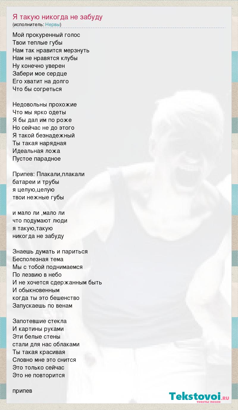 Мой прокуренный голос Твои теплые губы Нам так нравится мерзнуть Нам не нравятся клубы Ну конечно уверен Забери мое сердце Его хватит на долго Что бы согреться Недовольны прохожие Что мы ярко одеты Я бы дал им по роже Но сейчас не до этого Я такой безнадежный Ты такая нарядная Идеальная ложа Пустое парадное Припев: Плакали,плакали батареи и трубы я целую,целую твои нежные губы и мало ли ,мало ли что подумают люди я такую,такую никогда не забуду Знаешь думать и париться Бесполезная тема Мы с тобой поднимаемся По лезвию в небо И не хочется сдержанным быть И обыкновенным когда ты это бешенство Запускаешь по венам Запотевшие стекла И картины руками Эти белые стены стали для нас облаками Ты такая красивая Словно мне это снится Это только сейчас Это не повторится припев