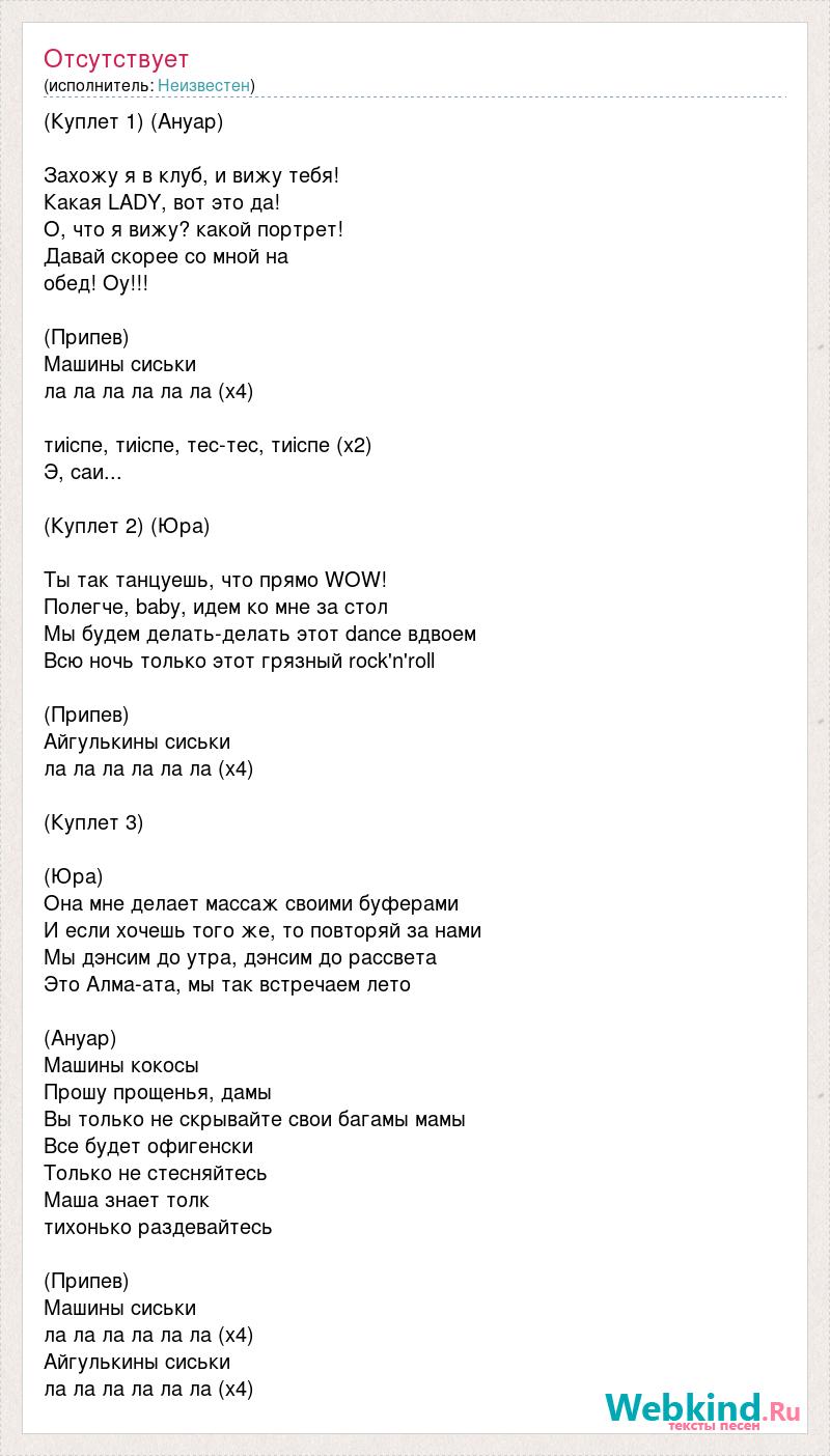 (Куплет 1) (Ануар) Захожу я в клуб, и вижу тебя! Какая LADY, вот это да! О, что я вижу? какой портрет! Давай скорее со мной на обед! Оу!!! (Припев) Машины сиськи ла ла ла ла ла ла (x4) тиiспе, тиiспе, тес-тес, тиiспе (x2) Э, саи... (Куплет 2) (Юра) Ты так танцуешь, что прямо WOW! Полегче, baby, идем ко мне за стол Мы будем делать-делать этот dance вдвоем Всю ночь только этот грязный rock'n'roll (Припев) Айгулькины сиськи ла ла ла ла ла ла (x4) (Куплет 3) (Юра) Она мне делает массаж своими буферами И если хочешь того же, то повторяй за нами Мы дэнсим до утра, дэнсим до рассвета Это Алма-ата, мы так встречаем лето (Ануар) Машины кокосы Прошу прощенья, дамы Вы только не скрывайте свои багамы мамы Все будет офигенски Только не стесняйтесь Маша знает толк тихонько раздевайтесь (Припев) Машины сиськи ла ла ла ла ла ла (x4) Айгулькины сиськи ла ла ла ла ла ла (x4)