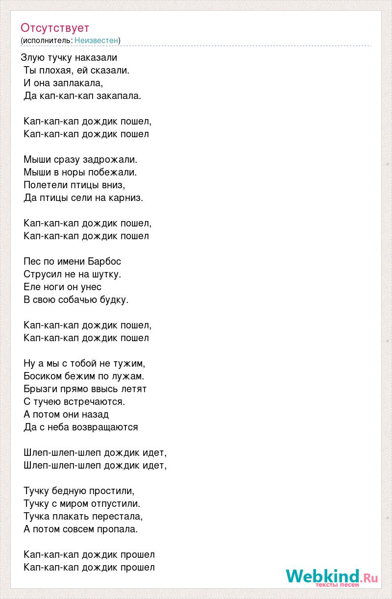Злую тучку наказали Ты плохая, ей сказали. И она заплакала, Да кап-кап-кап закапала. Кап-кап-кап дождик пошел, Кап-кап-кап дождик пошел Мыши сразу задрожали. Мыши в норы побежали. Полетели птицы вниз, Да птицы сели на карниз. Кап-кап-кап дождик пошел, Кап-кап-кап дождик пошел Пес по имени Барбос Струсил не на шутку. Еле ноги он унес В свою собачью будку. Кап-кап-кап дождик пошел, Кап-кап-кап дождик пошел Ну а мы с тобой не тужим, Босиком бежим по лужам. Брызги прямо ввысь летят С тучею встречаются. А потом они назад Да с неба возвращаются Шлеп-шлеп-шлеп дождик идет, Шлеп-шлеп-шлеп дождик идет, Тучку бедную простили, Тучку с миром отпустили. Тучка плакать перестала, А потом совсем пропала. Кап-кап-кап дождик прошел Кап-кап-кап дождик прошел