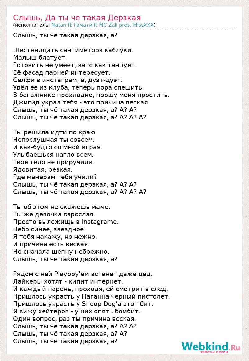 Слышь, ты чё такая дерзкая, а? Шестнадцать сантиметров каблуки. Малыш блатует. Готовить не умеет, зато как танцует. Её фасад парней интересует. Селфи в инстаграм, а, дуэт-дуэт. Увёл ее из клуба, теперь пора спешить. В багажнике прохладно, прошу меня простить. Джигид украл тебя - это причина веская. Слышь, ты чё такая дерзкая, а? А? А? Слышь, ты чё такая дерзкая, а? А? А? А? Ты решила идти по краю. Непослушная ты совсем. И как-будто со мной играя. Улыбаешься нагло всем. Твоё тело не приручили. Ядовитая, резкая. Где манерам тебя учили? Слышь, ты чё такая дерзкая, а? А? А? Слышь, ты чё такая дерзкая, а? А? А? А? Ты об этом не скажешь маме. Ты же девочка взрослая. Просто выложищь в instagramе. Небо синее, звёздное. Я тебя накажу, но нежно. И причина есть веская. Но сначала шепну небрежно. Слышь, ты чё такая дерзкая, а? Рядом с ней Plаyboy'ем встанет даже дед. Лайкеры хотят - кипит интернет. И каждый парень, проходя, ей смотрит в след, Пришлось украсть у Наганна черный пистолет. Пришлось украсть у Snoop Dog'а этот бит. Я вижу хейтеров - у них опять бомбит. Один вопрос, раз ты причина веская. Слышь, ты чё такая дерзкая, а? А? А? Слышь, ты чё такая дерзкая, а? А? Слышь, ты чё такая дерзкая, а?