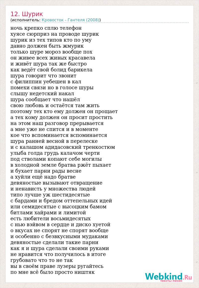 ночь крепко сплю телефон хуясе сюрприз на проводе шурик шурик из тех типов кто по уму давно должен быть жмурик только шуре мороз вообще пох он живее всех живых красавела и живёт шура так же быстро как ведёт свой болид барикела шура говорит что звонит с филиппин уебешен в кал помехи связи но в голосе шуры слышу недетский накал шура сообщает что нашёл свою любовь и остаётся там жить поэтому тех кто ему должен он прощает а тех кому должен он просит простить на этом наш разговор прерывается а мне уже не спится и в моменте кое что вспоминается вспоминается шура ранней весной в перелеске и с калашом адидасовский тренкостюм улыба голда грудь калачом черти под стволами копают себе могилы в холодной земле братва ржёт пыхает и бухает парни рады весне а хуйли ещё надо братве девяностые вызывают отвращение и ненависть у множества людей типо лучше уж шестидесятые с бардами и бредом оттепельных идей или семидесятые с высоцким бамом битлами хайрами и лимитой есть любители восьмидесятых с нью вэйвом в сердце и диско хуетой о вкусах не спорят не спорят вообще и особенно с безвкусными мудаками девяностые сделали такие парни как я и шура сделали своими руками не нравится что получилось в итоге грубовато что то не так вы в своём праве лузеры ругайтесь по мне всё было просто ништяк